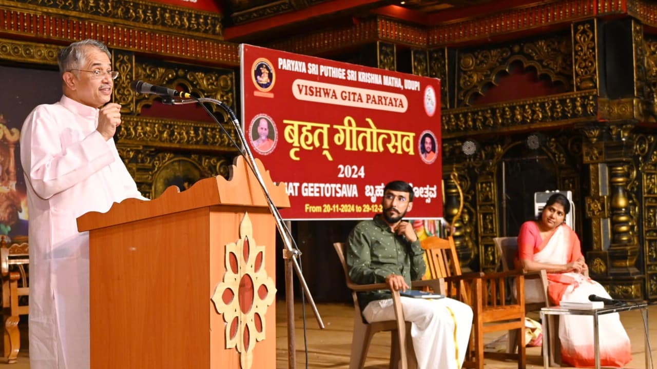 ಭಾರತದ ಮೂಲ ಸಂವಿಧಾನದಲ್ಲಿ ಪ್ರಾರಂಭದ ಪುಟದಲ್ಲಿ ಭಗವದ್ಗೀತೆ, ರಾಮಾಯಣಕ್ಕೆ ಸಂಬಂಧಿಸಿ ಚಿತ್ರಗಳನ್ನು ಚಿತ್ರಿಸಲಾಗಿದೆ. ಸಂವಿಧಾನ ರಚನ ಸಭೆಯಲ್ಲಿ ವಿವಿಧ ಕ್ಷೇತ್ರಗಳ ಪಂಡಿತರಿದ್ದು, ಭಗವದ್ಗೀತೆಯ ಬಗ್ಗೆಯೂ ಚರ್ಚೆಯಾಗಿತ್ತು ಎಂಬುದಕ್ಕೆ ಪಂಡಿತ್ ಬಾಲಕೃಷ್ಣ ಶಾಸ್ತ್ರಿ ಭಾಷಣ ಪುಷ್ಟಿ ನೀಡುತ್ತದೆ ಎಂದು ಕರ್ನಾಟಕ ಹೈಕೋರ್ಟ್ ಉಚ್ಚ ನ್ಯಾಯಾಲಯದ ನ್ಯಾಯಧೀಶ ನ್ಯಾ.ವಿ. ಶ್ರೀಶಾನಂದ ಅಭಿಪ್ರಾಯಪಟ್ಟರು.ಬುಧವಾರ ಶ್ರೀಕೃಷ್ಣ ಮಠದ ಗೀತೋತ್ಸವದಲ್ಲಿ ಭಾಗವಹಿಸಿ ‘ನ್ಯಾಯಾಂಗದಲ್ಲಿ ಭಗವದ್ಗೀತೆ ಪ್ರಸ್ತುತತೆ’ ವಿಷಯದ ಕುರಿತಾಗಿ ಮಾತನಾಡಿದರು. ಸಂವಿಧಾನ ಹಾಗು ಧರ್ಮವನ್ನು ಸಂಪೂರ್ಣವಾಗಿ ಅಧ್ಯಯನ ಮಾಡಿದವರಿಗೆ ಇವೆರಡನ್ನೂ ಒಟ್ಟಿಗೆ ಕೊಂಡೊಯ್ಯಲು ಯಾವುದೇ ತಾಕಲಾಟ ಎಂದೂ ಬರುವುದಿಲ್ಲ. 2018 ರ ಸುಪ್ರೀಂ ಕೋರ್ಟಿನ ಅಂಗಾಂಗ ದಾನ ಪ್ರಕರಣದ ತೀರ್ಪೊಂದರಲ್ಲಿ ಸಾಂವಿಧಾನಿಕ ಪೀಠವು ಭಗವದ್ಗೀತೆಯ ನಿದರ್ಶನ ಪಡೆದು ತೀರ್ಪು ನೀಡಿದ ಬಗ್ಗೆ ಉಲ್ಲೇಖವಿದೆ. ಇಂತಹ ಅನೇಕ ಪ್ರಕರಣಗಳು ಅಧ್ಯಯನ ನಮಗೆ ಸಿಗುತ್ತದೆ ಎಂದರು.