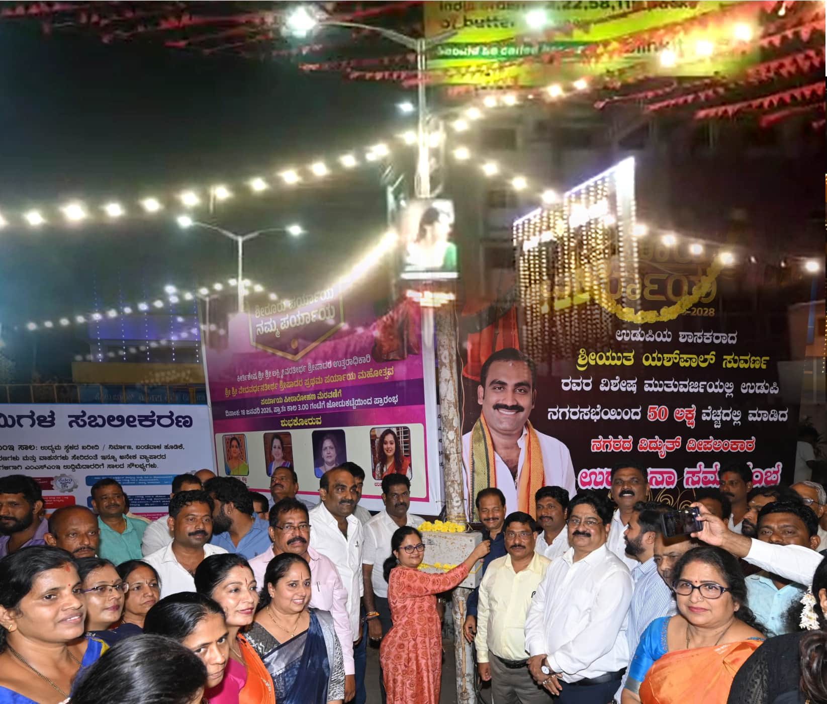 ನಂತರ ಅವರು ಮೊದಲ ಬಾರಿಗೆ ಪರ್ಯಾಯ ಕಾರ್ಯಕ್ರಮದಲ್ಲಿ ಭಾಗವಹಿಸುತ್ತಿದ್ದೇನೆ, ಸಿಂಗಾರಗೊಂಡ ನಗರ, ಬೀದಿಗಳು ಪರ್ಯಾಯದ ಸಿದ್ಧತೆಗಳು ಅತ್ಯಂತ ವ್ಯವಸ್ಥಿತವಾಗಿ ನಡೆಯುತ್ತಿರುವುದು ಸಂತೋಷವಾಗಿದೆ ಎಂದರು. ಕಾರ್ಯಕ್ರಮದಲ್ಲಿ ಸ್ವಾಗತ ಸಮಿತಿ ಅಧ್ಯಕ್ಷ ಶಾಸಕ ಯಶ್ಪಾಲ್ ಸುವರ್ಣ ಶೀರೂರು ಪರ್ಯಾಯಕ್ಕೆ ಉಡುಪಿ ನಗರ ಮದುವಣಗಿತ್ತಿಯಂತೆ ಸಿಂಗಾರಗೊಂಡಿದೆ. ಇದರ ಮೆರುಗು ಹೆಚ್ಚಿಸಲು ಈ ಬಾರಿ ಉಡುಪಿ ನಗರಸಭೆ ಅನುದಾನದೊಂದಿಗೆ 50 ಲಕ್ಷ ರು. ವೆಚ್ಚದಲ್ಲಿ ವಿಶೇಷವಾಗಿ ಈ ವಿದ್ಯುತ್ ದೀಪಾಲಂಕಾರ ಮಾಡಲಾಗಿದೆ ಎಂದರು.ವಿದ್ಯುದ್ದೀಪಾಲಂಕಾರ ವ್ಯವಸ್ಥೆ ಮಾಡಿದ ಕೃಷ್ಣ ಕುಲಾಲ್ ಅವರನ್ನು ಶಾಸಕರು ಅಭಿನಂದಿಸಿದರು. ಕೆನರಾಬ್ಯಾಂಕ್ ಜಿಎಂ ಗಂಗಾಧರ್, ನಗರಸಭೆ ಆಯುಕ್ತ ಮಹಾಂತೇಶ್, ನಗರಸಭೆ ನಿಕಟಪೂರ್ವ ಅಧ್ಯಕ್ಷ ಪ್ರಭಾಕರ್ ಪೂಜಾರಿ ಮತ್ತು ಉಪಾದ್ಯಕ್ಷೆ ರಜನಿ ಹೆಬ್ಬಾರ್, ಬಿಜೆಪಿ ಜಿಲ್ಲಾಧ್ಯಕ್ಷ ನವೀನ್ ಶೆಟ್ಟಿ ಕುತ್ಯಾರ್, ಸ್ವಾಗತ ಸಮಿತಿ ಪ್ರಧಾನ ಕಾರ್ಯದರ್ಶಿ ಮಟ್ಟಾರ್ ರತ್ನಾಕರ್ ಹೆಗ್ಡೆ, ಪ್ರಚಾರ ಸಮಿತಿ ಸಂಚಾಲಕ ನಂದನ್ ಜೈನ್, ಪ್ರಮುಖರಾದ ವಿಷ್ಣುಮೂರ್ತಿ ಆಚಾರ್ಯ, ನಯನಾ ಗಣೇಶ್, ಪದ್ಮಲತಾ ಮೊದಲಾದವರು ಉಪಸ್ಥಿತರಿದ್ದರು.