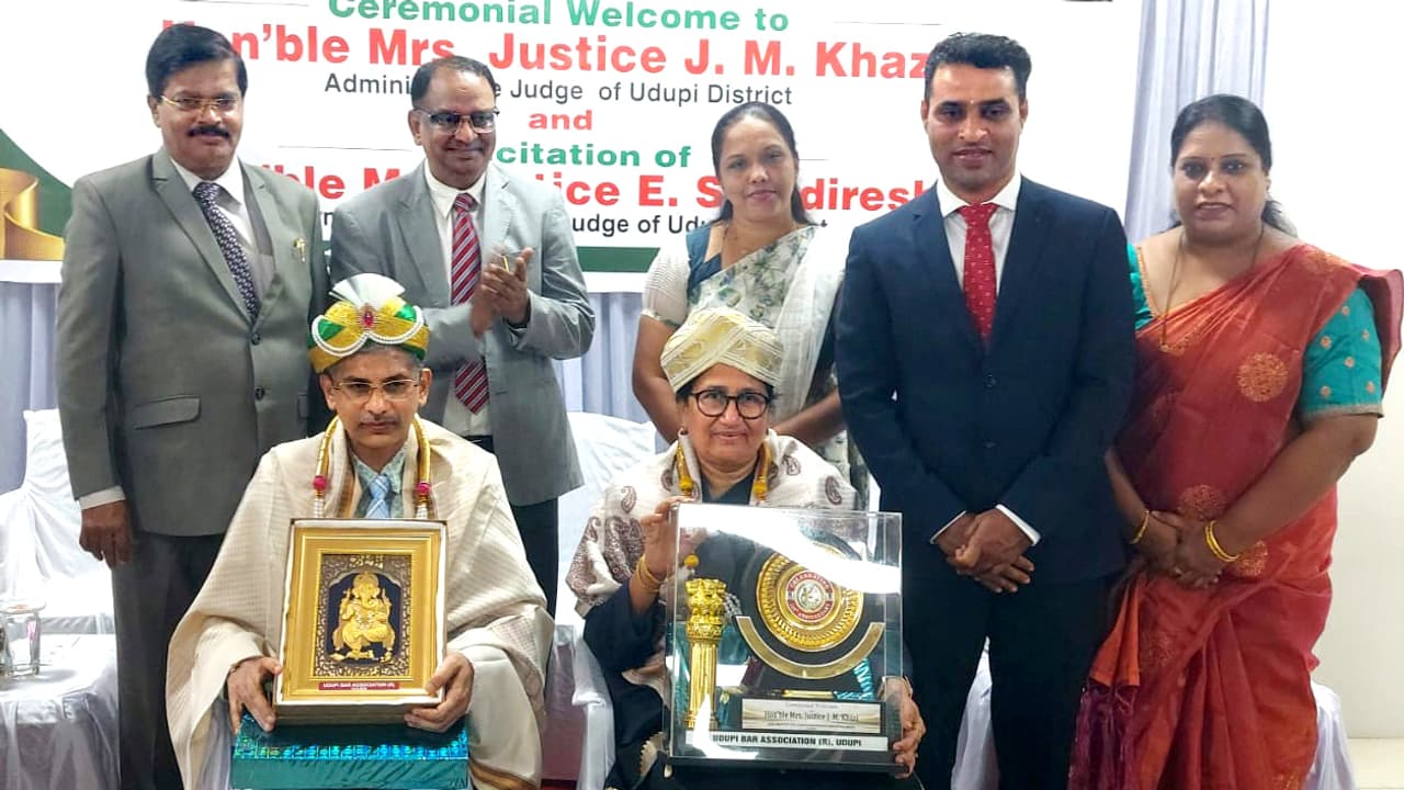 ಉಡುಪಿ: ಉಡುಪಿ ಜಿಲ್ಲೆಯ ನೂತನ ಆಡಳಿತಾತ್ಮಕ ನ್ಯಾಯಮೂರ್ತಿಯಾಗಿ ನೇಮಕಗೊಂಡ ನ್ಯಾ.ಜೆ.ಎಂ.ಖಾಝಿ ಅವರಿಗೆ ಉಡುಪಿ ವಕೀಲರ ಸಂಘದ ವತಿಯಿಂದ ಸ್ವಾಗತ ಹಾಗೂ ಜಿಲ್ಲೆಯ ನಿಕಟಪೂರ್ವ ಆಡಳಿತಾತ್ಮಕ ನ್ಯಾಯಮೂರ್ತಿ ಇ.ಎಸ್.ಇಂದಿರೇಶ್ ಅವರಿಗೆ ಬಿಳ್ಕೋಡುಗೆ ಕಾರ್ಯಕ್ರಮ ಜಿಲ್ಲಾ ನ್ಯಾಯಾಲಯದ ಸಭಾಂಗಣದಲ್ಲಿ ನಡೆಯಿತು.ಸನ್ಮಾನ ಸ್ವೀಕರಿಸಿ ಮಾತನಾಡಿದ ನೂತನ ಆಡಳಿತಾತ್ಮಕ ನ್ಯಾಯಮೂರ್ತಿ ಜೆ. ಎಂ. ಖಾಝಿ ಅವರು, ನ್ಯಾಯಾಲಯಕ್ಕೆ ಬರುವ ಪ್ರತಿ ಪ್ರಕರಣದಲ್ಲೂ ಮಾನವೀಯ ಮೌಲ್ಯ ಅಡಗಿದೆ. ಅದನ್ನು ನಾವು ಕಂಡುಕೊಳ್ಳುವ ಪ್ರಯತ್ನ ಮಾಡಬೇಕು ಎಂದು ತಿಳಿಸಿದರು.