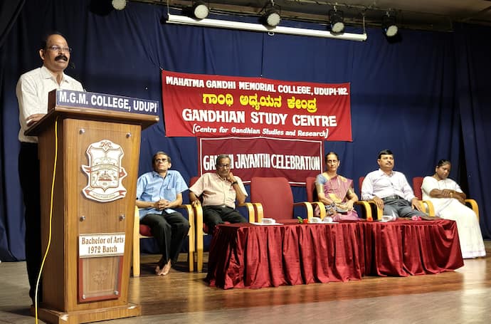 ಉಡುಪಿ ಡಾ.ಜಿ.ಶಂಕರ್ ಮಹಿಳಾ ಪ್ರಥಮ ದರ್ಜೆ ಕಾಲೇಜಿನ ಸಮಾಜಶಾಸ್ತ್ರ ವಿಭಾಗ ಮುಖ್ಯಸ್ಥ ಡಾ.ರಾಜೇಂದ್ರ ಕೆ. ಮುಖ್ಯ ಅತಿಥಿಯಾಗಿ ಆಗಮಿಸಿ ಮಾತನಾಡಿ, ಗಾಂಧೀಜಿ ಜೀವನವು ಇಂದಿನ ಆಧುನಿಕ ಕಾಲದಲ್ಲಿ ಬಹಳ ದೊಡ್ಡ ಸಂದೇಶವಾಗಬಲ್ಲದು. ಗಾಂಧೀಜಿಯ ಬಾಲ್ಯ, ವಿದ್ಯಾಭ್ಯಾಸ, ವಕೀಲಿಕೆ, ಸತ್ಯ-ಅಹಿಂಸೆ ಮೊದಲಾದ ನೈತಿಕ ಮೌಲ್ಯಗಳನ್ನು ಸ್ವಯಂ ಅಳವಡಿಸಿಕೊಳ್ಳುವಲ್ಲಿನ ಪ್ರಯತ್ನ, ಸಾಮಾಜಿಕ ಪಿಡುಗುಗಳ ವಿರುದ್ಧ ಹೋರಾಟ, ರಚನಾತ್ಮಕ ಕಾರ್ಯಗಳ ಅಳವಡಿಕೆ ಎಲ್ಲವೂ ನಮಗೆ ಇಂದೂ ದಾರಿದೀಪವಾಗಿವೆ. ಶಾಸ್ತ್ರೀಜಿಯವರೂ ಅಂತಹ ಉನ್ನತ ಆದರ್ಶಗಳನ್ನು ಬಾಳಿ ಬದುಕಿದವರು ಎಂದು ಅಭಿಪ್ರಾಯಪಟ್ಟರು.ಕಾಲೇಜಿನ ಪ್ರಾಂಶುಪಾಲೆ ಪ್ರೊ. ವನಿತಾ ಮಯ್ಯ ಅಧ್ಯಕ್ಷತೆ ವಹಿಸಿದರು. ಉಪಪ್ರಾಂಶುಪಾಲ ಡಾ. ಎಂ.ವಿಶ್ವನಾಥ್ ಪೈ, ಸಂಧ್ಯಾ ಕಾಲೇಜಿನ ಪ್ರಾಂಶುಪಾಲ ಡಾ. ದೇವಿದಾಸ್ ಎಸ್. ನಾಯ್ಕ, ಪದವಿಪೂರ್ವ ಕಾಲೇಜಿನ ಪ್ರಾಂಶುಪಾಲೆ ಪ್ರೊ. ಮಾಲತಿ ದೇವಿ ಎ. ಉಪಸ್ಥಿತರಿದ್ದು ಮೌಲಿಕ ಸಂದೇಶಗಳನ್ನು ನೀಡಿದರು.