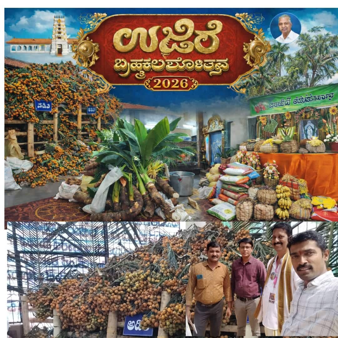 ಉಜಿರೆ ಶ್ರೀ ಜನಾರ್ದನ ಸ್ವಾಮಿ ದೇವಳ ಬ್ರಹ್ಮಕಲಶೋತ್ಸವದ ಹೊರೆಕಾಣಿಕೆ ಉಗ್ರಾಣ ತರಕಾರಿ, ಧಾನ್ಯ, ಅನ್ನಸಂತರ್ಪಣೆಗೆ ಬಳಸುವ ವಸ್ತುಗಳಿಂದ ತುಂಬಿ ತುಳುಕುತ್ತಿದೆ.