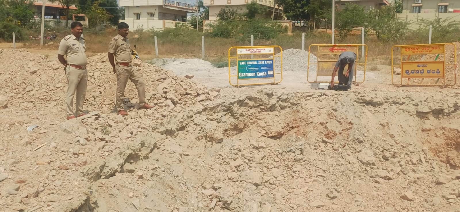ಕಂಪ್ಲಿ: ಪಟ್ಟಣದ ಹೊಸಪೇಟೆ ಬೈಪಾಸ್ ರಸ್ತೆಯಲ್ಲಿರುವ ಬಡಾವಣೆಯೊಂದರಲ್ಲಿ ಒಳಚರಂಡಿ ಕಾಮಗಾರಿ ವೇಳೆ ಕಲ್ಲುಬಂಡೆಯನ್ನು ಅನಧಿಕೃತ ಸ್ಫೋಟಕ ಬಳಸಿ ಸಿಡಿಸಿದ ಹಿನ್ನೆಲೆ ಶನಿವಾರ ಬಾಂಬ್ ನಿಷ್ಕ್ರಿಯ ತಂಡ ಹಾಗೂ ಅಪರಾಧ ಪರಿಶೀಲನಾ ತಂಡ ಸ್ಥಳಕ್ಕೆ ಭೇಟಿ ನೀಡಿ ಪರಿಶೀಲನೆ ನಡೆಸಿತು.