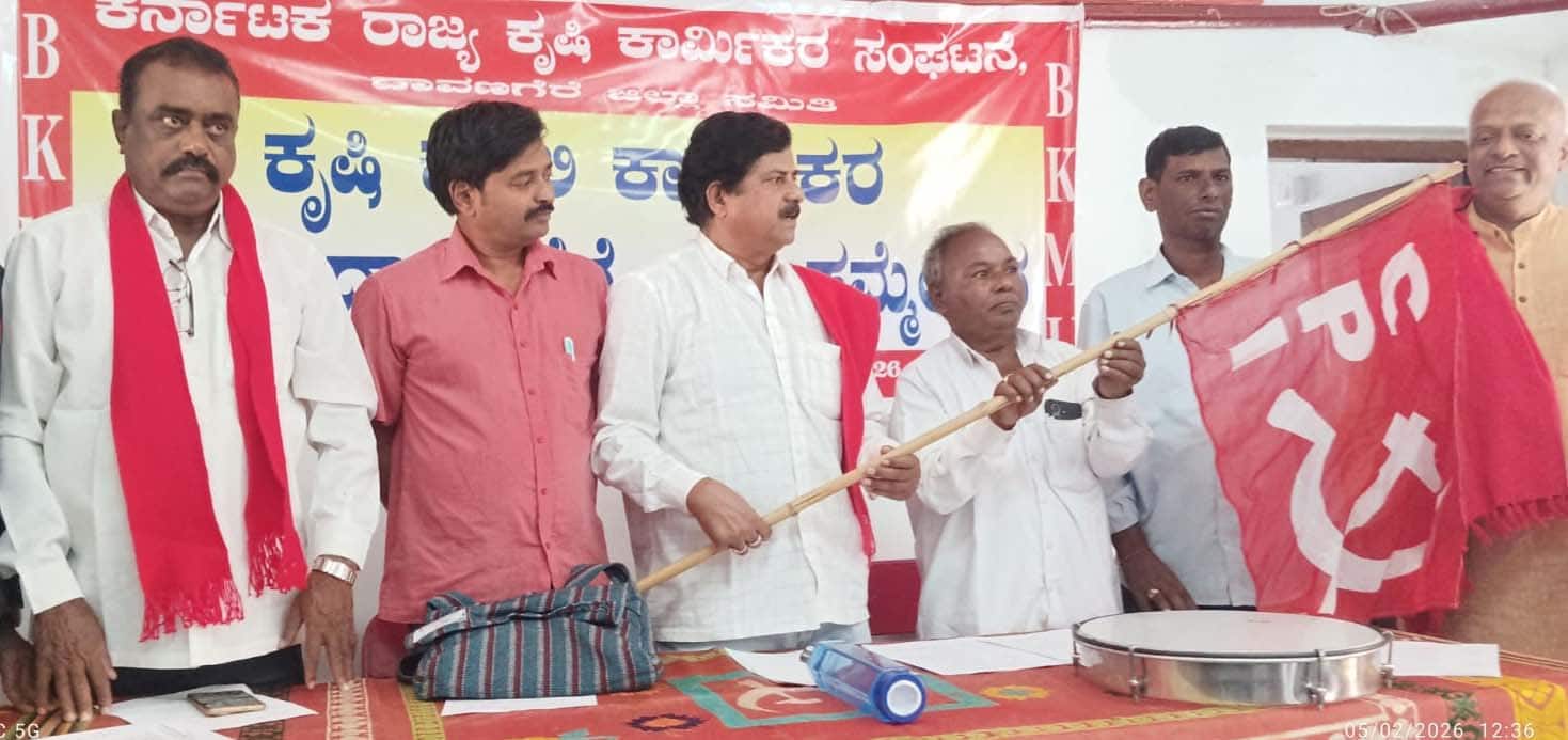 (ಕೋಟ್) ಕೃಷಿ ಕೂಲಿ ಕಾರ್ಮಿಕರ ಸಂಘಟನೆ ಜಿಲ್ಲಾಧ್ಯಕ್ಷ ಆವರಗೆರೆ ಚಂದ್ರು ಕಾರ್ಯಕ್ರಮದ ಅಧ್ಯಕ್ಷತೆವಹಿಸಿ ಮಾತನಾಡಿ ಕೃಷಿ ಕಾರ್ಮಿಕರ ಕಲ್ಯಾಣ ಮಂಡಳಿ ಜಾರಿ ತರುವವರೆಗೂ ಸರ್ಕಾರಗಳ ವಿರುದ್ಧ ನಮ್ಮ ಹೋರಾಟ ನಿರಂತರವಾಗಿ ನಡೆಯುತ್ತದೆ.- ಎಚ್.ಎಂ. ಸಂತೋಷ್, ಮುಖಂಡ.
