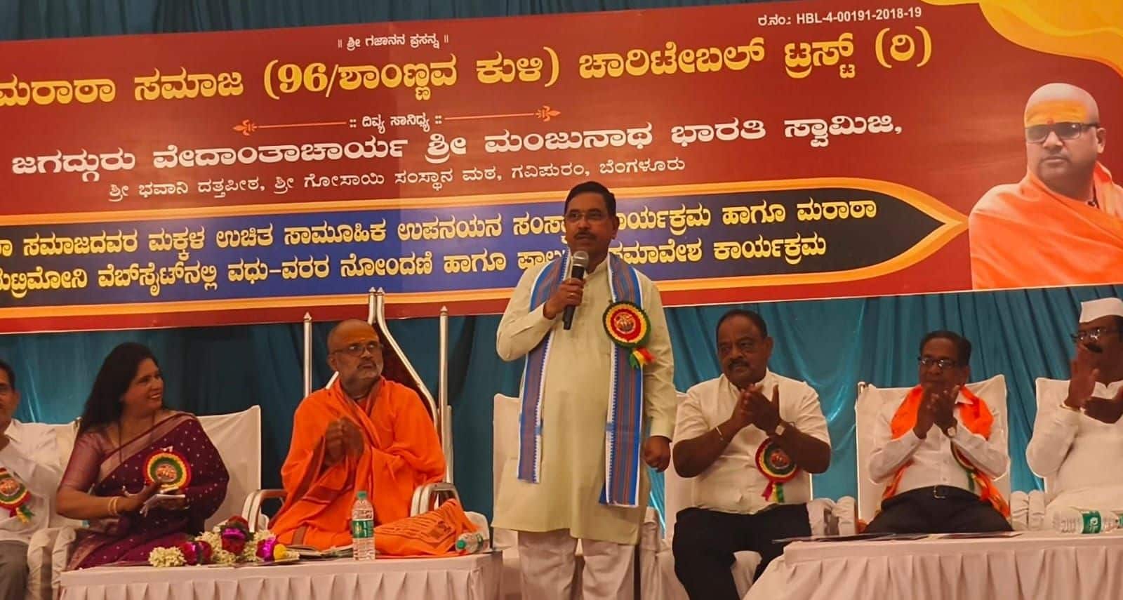 ನಗರದ ತುಳಜಾ ಭವಾನಿ ದೇವಸ್ಥಾನದ ಬಳಿ ಕ್ಷತ್ರಿಯ ಮರಾಠಾ ಸಮಾಜ (96/ಶಾಂಣ್ಣವ ಕುಳಿ) ಚಾರಿಟೇಬಲ್ ಟ್ರಸ್ಟ್ ವತಿಯಿಂದ ಭಾನುವಾರ ಆಯೋಜಿಸಲಾಗಿದ್ದ ಮರಾಠಾ ಸಮಾಜದವರ ಮಕ್ಕಳ ಉಚಿತ ಸಾಮೂಹಿಕ ಉಪನಯನ ಸಂಸ್ಕಾರ ಕಾರ್ಯಕ್ರಮ ಹಾಗೂ ಮರಾಠಾ ಮೆಟ್ರಿಮೋನಿ ವೆಬ್ಸೈಟ್ನಲ್ಲಿ ವಧು-ವರರ ನೋಂದಣಿ ಹಾಗೂ ಪಾಲಕರ ಸಮಾವೇಶ ಉದ್ಘಾಟಿಸಿ ಮಾತನಾಡಿದರು.ಇಂದಿನ ದಿನಗಳಲ್ಲಿ ಉಪನಯನ ಮಾಡಿಸಿಕೊಳ್ಳಲು ಮಕ್ಕಳು ಅನೇಕ ಕಾರಣಗಳಿಂದ ಹಿಂಜರಿಯುತ್ತಾರೆ. ಆದರೆ, ಅವರಿಗೆ ಈ ಉಪನಯನದ ಮಹತ್ವವನ್ನು ಮನಗಾಣಿಸಿ ಇಂತಹ ಕಾರ್ಯಕ್ರಮವನ್ನು ಆಯೋಜಿಸಿದ್ದು ನಿಜಕ್ಕೂ ಶ್ಲಾಘನೀಯ. ಸಾಮೂಹಿಕವಾಗಿ ಉಪನಯನ ಅಥವಾ ವಿವಾಹಗಳನ್ನು ಆಯೋಜಿಸುವುದು ಸಮಾಜದಲ್ಲಿ ಒಗ್ಗಟ್ಟು ಮೂಡಿಸುತ್ತದೆ. ಮರಾಠಾ ಸಮಾಜಕ್ಕೆ ಮತ್ತು ಬಿಜೆಪಿಗೆ ಅವಿನಾಭಾವ ಸಂಬಂಧವಿದೆ. ಏಕೆಂದರೆ ಅಂದು ಛತ್ರಪತಿ ಶಿವಾಜಿ ಮಹಾರಾಜರು ಪಾಲಿಸಿದ ಆದರ್ಶಗಳಾದ ಯಾವುದೇ ಭೇದ-ಭಾವ ಅಥವಾ ಪಕ್ಷಪಾತವಿಲ್ಲದೆ ಎಲ್ಲರನ್ನೂ ಸಮಾನತೆಯಿಂದ ಕಾಣುವ ಹಿಂದುತ್ವದ ದೃಷ್ಟಿಕೋನವನ್ನು ಇಂದು ಬಿಜೆಪಿ ಪಾಲಿಸುತ್ತ ಬಂದಿದೆ. ಅಲ್ಲದೆ ಹಿಂದುತ್ವವನ್ನು ಪ್ರತಿಪಾಲಿಸುತ್ತ ಬಂದಿರುವ ಮರಾಠಾ ಸಮಾಜ ಎಂದಿಗೂ ನನ್ನ ಮತ್ತು ಬಿಜೆಪಿ ಬೆಂಬಲಕ್ಕೆ ನಿಂತಿದ್ದು, ಇದಕ್ಕೆ ನಾನು ಚಿರಋಣಿಯಾಗಿದ್ದೇನೆ ಎಂದರು.