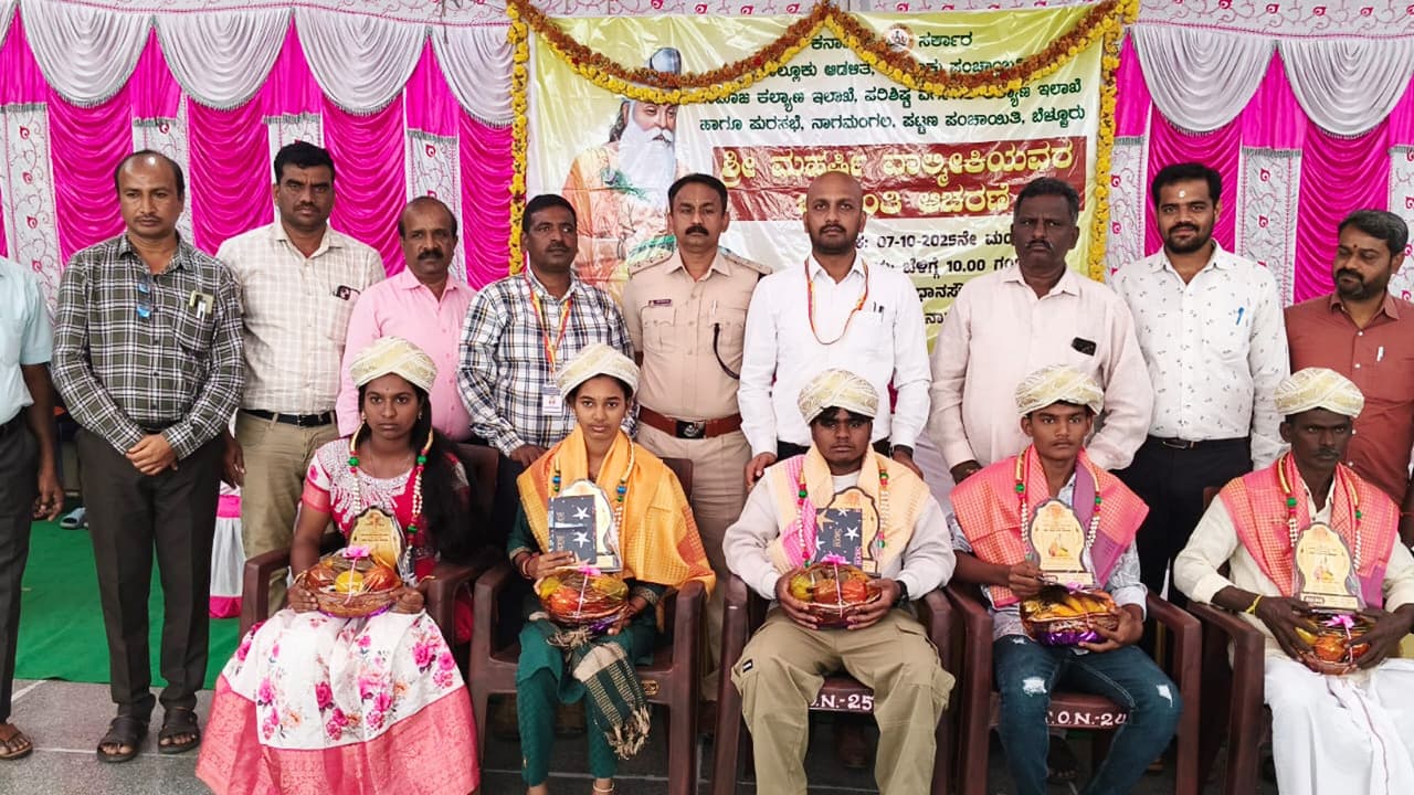 ಕಾರ್ಯಕ್ರಮಕ್ಕೂ ಮುನ್ನ ತಾಲೂಕು ಆಡಳಿತ ಸೌಧದ ಮುಂಭಾಗದ ಡಾ.ಬಿ.ಆರ್.ಅಂಬೇಡ್ಕರ್ ಮತ್ತು ಮಹಾತ್ಮ ಗಾಂಧೀಜಿ ಪ್ರತಿಮೆಗಳಿಗೆ ತಹಸೀಲ್ದಾರ್ ಜಿ.ಆದರ್ಶ ಸೇರಿದಂತೆ ವಿವಿಧ ಇಲಾಖೆಗಳ ಅಧಿಕಾರಿಗಳು ಹೂಮಾಲೆ ಹಾಕಿ ಗೌರವ ನಮನ ಸಲ್ಲಿಸಿದ ನಂತರ ವಾಲ್ಮೀಕಿ ಭಾವಚಿತ್ರಕ್ಕೆ ಪುಷ್ಪಾರ್ಚನೆ ಮಾಡಿ ಭಕ್ತಿ ನಮನ ಸಲ್ಲಿಸಿದರು.ವೇದಿಕೆಯಲ್ಲಿ ವಿವಿಧ ಕ್ಷೇತ್ರಗಳಲ್ಲಿ ಸಾಧನೆ ಮಾಡಿರುವ ಐವರು ಸಾಧಕರೂ ಸೇರಿದಂತೆ ಕಳೆದ ಎಸ್ಸೆಸ್ಸೆಲ್ಸಿ ಮತ್ತು ಪಿಯುಸಿ ಪರೀಕ್ಷೆಯಲ್ಲಿ ಅತಿ ಹೆಚ್ಚು ಅಂಕಗಳಿಸಿದ ಐದು ಮಂದಿ ವಿದ್ಯಾರ್ಥಿಗಳು ಹಾಗೂ ಅಂತರಾಷ್ಟ್ರೀಯ ಜಾನಪದ ಕಲಾವಿದೆ ತೊಳಲಿ ಗ್ರಾಮದ ಕು.ಚೈತ್ರ ಮತ್ತು ಶಿಕ್ಷಕ ನಂದನ್ ಅವರನ್ನು ಸನ್ಮಾನಿಸಲಾಯಿತು.