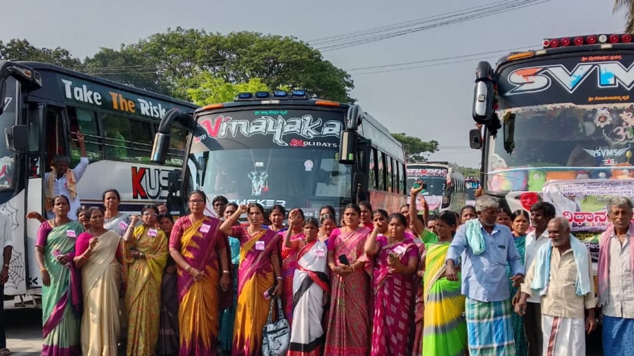 ವಿಬಿ ರಾಮ್ ಜಿ ಮಸೂದೆ ವಿರೋಧಿಸಿ ಹಾಗೂ ವಿವಿಧ ಬೇಡಿಕೆಗಳ ಈಡೇರಿಕೆಗೆ ಒತ್ತಾಯಿಸಿ ಅಖಿಲ ಭಾರತ ಜನವಾದಿ ಮಹಿಳಾ ಸಂಘಟನೆಗಳ ತಾಲೂಕು ಕಾರ್ಯಕರ್ತರು ಗುರುವಾರ ವಿಧಾನಸೌಧ ಚಲೋ ನಡೆಸಿದರು.ಪಟ್ಟಣದ ಪ್ರವಾಸಿ ಮಂದಿರದ ಬಳಿ ಸುಮಾರು 300ಕ್ಕೂ ಹೆಚ್ಚು ಕಾರ್ಯಕರ್ತರಿದ್ದ ಬಸ್ಗಳಿಗೆ ಜನವಾದಿ ಮಹಿಳಾ ಸಂಘಟನೆ ರಾಜ್ಯ ಸಮಿತಿ ಸದಸ್ಯೆ ಶೋಭಾ ಹಾಗೂ ಜಿಲ್ಲಾ ಅಧ್ಯಕ್ಷೆ ಡಿ.ಕೆ.ಲತಾ ಜಂಟಿ ಚಾಲನೆ ನೀಡಿದರು.