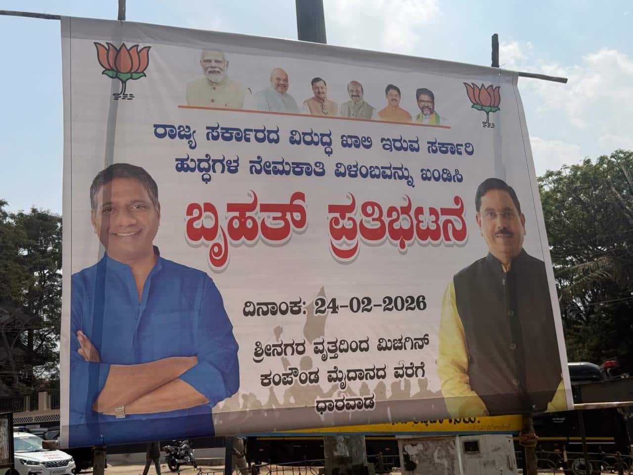 ಸರ್ಕಾರದ ವಿವಿಧ ಇಲಾಖೆಗಳಲ್ಲಿ ಖಾಲಿ ಇರುವ ಹುದ್ದೆಗಳ ಭರ್ತಿಗಾಗಿ ಮಂಗಳವಾರ ಬಿಜೆಪಿ ನಡೆಸಿದ ಪ್ರತಿಭಟನಾರ್ಥ ಹಾಕಲಾಗಿದ್ದ ಯಾವ ಬ್ಯಾನರ್ಗಳಲ್ಲೂ ಪಕ್ಷದ ರಾಜ್ಯಾಧ್ಯಕ್ಷರ ಭಾವಚಿತ್ರ ಇಲ್ಲದಿರುವುದು ತೀವ್ರ ಅಚ್ಚರಿ ಮೂಡಿಸಿದೆ.ಉದ್ಯೋಗಾರ್ಥಿಗಳ ಪರವಾಗಿ ಬಿಜೆಪಿಯಿಂದಲೇ ಹೋರಾಟಕ್ಕೆ ಕರೆ ನೀಡಲಾಗಿತ್ತು. ಶ್ರೀನಗರ ವೃತ್ತದಿಂದ ಜಯನಗರ ಮಾರ್ಗವಾಗಿ ಮಿಚಗಿನ್ ಕಾಂಪೌಂಡ್ ವರೆಗೂ ಸುಮಾರು 40ಕ್ಕೂ ಹೆಚ್ಚು ಕಡೆಗಳಲ್ಲಿ ಬ್ಯಾನರ್ ಅಳವಡಿಸಲಾಗಿತ್ತು. ಬ್ಯಾನರ್ಗಳಲ್ಲಿ ಮೇಲುಗಡೆ ಪ್ರಧಾನಿ ನರೇಂದ್ರ ಮೋದಿ, ಗೃಹ ಸಚಿವ ಅಮಿತ ಶಾ, ರಾಷ್ಟ್ರೀಯ ಅಧ್ಯಕ್ಷ ನಿತಿನ್ ನಬಿನ್, ಮಾಜಿ ಮುಖ್ಯಮಂತ್ರಿ ಬಸವರಾಜ ಬೊಮ್ಮಾಯಿ, ವಿಧಾನಸಭಾ ವಿರೋಧ ಪಕ್ಷದ ನಾಯಕ ಆರ್. ಅಶೋಕ, ವಿಧಾನಪರಿಷತ್ ವಿಪಕ್ಷ ನಾಯಕ ಛಲವಾದಿ ನಾರಾಯಣ ಸ್ವಾಮಿ ಭಾವಚಿತ್ರಗಳಿವೆ. ಹಾಗೆಯೇ, ಕೆಳ ಭಾಗದಲ್ಲಿ ಎಡಗಡೆ ಶಾಸಕ ಅರವಿಂದ ಬೆಲ್ಲದ ಹಾಗೂ ಕೇಂದ್ರ ಸಚಿವ ಪ್ರಹ್ಲಾದ ಜೋಶಿ ಭಾವಚಿತ್ರಗಳನ್ನು ದೊಡ್ಡ ಅಳತೆಯಲ್ಲಿವೆ. ಆದರೆ, ಈ ಯಾವ ಬ್ಯಾನರ್ಗಳಲ್ಲೂ ಪಕ್ಷದ ರಾಜ್ಯಾಧ್ಯಕ್ಷ ಬಿ.ವೈ. ವಿಜಯೇಂದ್ರ ಅವರ ಭಾವಚಿತ್ರ ಇಲ್ಲದಿರುವುದು ಅವರ ಅಭಿಮಾನಿಗಳನ್ನು ಇದೀಗ ಕೆರಳಿಸಿದೆ.