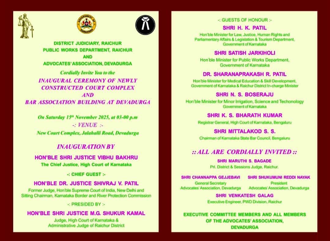 ಪಟ್ಟಣದ ಜಾಲಹಳ್ಳಿ ರಸ್ತೆಯಲ್ಲಿ ಹೊಸದಾಗಿ ನಿರ್ಮಿಸಿರುವ ತಾಲೂಕು ನ್ಯಾಯಾಲಯ ಸಂಕೀರ್ಣ ಹಾಗೂ ಬಾರ್ ಅಸೋಸಿಯೇಷನ್ ಕಟ್ಟಡಗಳ ಉದ್ಘಾಟನಾ ಆಹ್ವಾನ ಪತ್ರಿಕೆಯಲ್ಲಿ ಸ್ಥಳೀಯ ಜೆಡಿಎಸ್ ಶಾಸಕಿ ಕರೆಮ್ಮ ಜಿ.ನಾಯಕ ಅವರ ಹೆಸರು ಕೈಬಿಟ್ಟು ಶಿಷ್ಠಾಚಾರ ಉಲ್ಲಂಘಿಸಲಾಗಿದೆ ಎನ್ನುವ ಗಂಭೀರ ಆರೋಪ ಕೇಳಿಬಂದಿದೆ.ಇದೇ ನ.15 ಶನಿವಾರ ಮಧ್ಯಾಹ್ನ 3 ಕ್ಕೆ ನ್ಯಾಯಾಲಯ ಸಂಕೀರ್ಣದ ಹೊಸ ಕಟ್ಟಡ ಉದ್ಘಾಟನಾ ಕಾರ್ಯಕ್ರಮ ಆಯೋಜಿಸಿದ್ದು, ಸಮಾರಂಭದ ಆಹ್ವಾನ ಪತ್ರಿಕೆಯಲ್ಲಿ ನ್ಯಾಯಾಧೀಶರು, ನಿವೃತ್ತ ನ್ಯಾಯಾಧೀಶರು, ಸಚಿವರು, ಅಧಿಕಾರಿ ಹಾಗೂ ದೇವದುರ್ಗ ವಕೀಲರ ಸಂಘದ ಅಧ್ಯಕ್ಷರ, ಸದಸ್ಯರ ಹೆಸರುಗಳನ್ನು ಸೇರಿಸಲಾಗಿದೆ ಆದರೇ ದೇವದುರ್ಗ ವಿಧಾನಸಭಾ ಕ್ಷೇತ್ರವನ್ನು ಪ್ರತಿನಿಧಿಸುತ್ತಿರುವ ಜೆಡಿಎಸ್ ಮಹಿಳಾ ಶಾಸಕಿ ಕರೆಮ್ಮ ಜಿ.ನಾಯಕ ಅವರ ಹೆಸರನ್ನು ಕೈಬಿಟ್ಟಿರುವುದು ಶಾಸಕರು, ಬೆಂಬಲಿಗರು ಹಾಗೂ ಅಭಿಮಾನಿಗಳು ತೀವ್ರ ಅಸಮಾಧಾನಗೊಂಡಿದ್ದಾರೆ.
