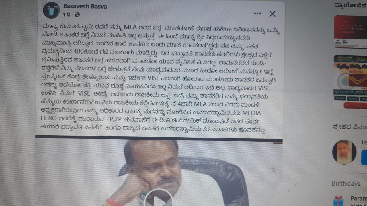 ಈ ನಡುವೆ ಕಾರ್ಖಾನೆ ಅಭಿವೃದ್ಧಿಗೆ ಸಂಬಂಧಿಸಿದಂತೆ ರಾಜಕೀಯ ದ್ವೇಷಪೂರಿತ ಸುದ್ದಿಗಳು ಸಾಮಾಜಿಕ ಜಾಲತಾಣಗಳಲ್ಲಿ ಹರಿದಾಡುತ್ತಿವೆ.ಕಳೆದ ೨ ವರ್ಷಗಳಿಂದ ಕಾರ್ಖಾನೆ ಮುಂಭಾಗದಲ್ಲಿ ಗುತ್ತಿಗೆ ಕಾರ್ಮಿಕರು ನಡೆಸುತ್ತಿರುವ ಹೋರಾಟ ಕ್ಷೇತ್ರದ ಇತಿಹಾಸದಲ್ಲಿ ಅತಿ ದೊಡ್ಡ ಹೋರಾಟ ಎಂಬ ಹೆಗ್ಗಳಿಕೆ ಪಡೆದುಕೊಂಡಿದೆ. ಮತ್ತೊಂದೆಡೆ ಹೋರಾಟ ೩ನೇ ವರ್ಷಕ್ಕೆ ಕಾಲಿಡುತ್ತಿದ್ದು, ಗುತ್ತಿಗೆ ಕಾರ್ಮಿಕರ ಸಂಕಷ್ಟ ಕೇಳುವವರು ಯಾರು ಇಲ್ಲವಾಗಿದೆ. ಯಾವುದೇ ಒಂದು ಹೋರಾಟ ಸುಧೀರ್ಘವಾಗಿ ನಡೆಸಿಕೊಂಡು ಬರುವುದು ಎಂದರೆ ಸುಲಭದ ಕೆಲಸವಲ್ಲ. ಕಾರ್ಮಿಕ ಮುಖಂಡರು ಹಾಗೂ ಗುತ್ತಿಗೆ ಕಾರ್ಮಿಕರು ಹೋರಾಟದಲ್ಲಿ ಹೊಂದಿರುವ ನಂಬಿಕೆ, ಭರವಸೆ, ವಿಶ್ವಾಸ ಹಾಗೂ ಎಲ್ಲವನ್ನು ಸಹಿಸಿಕೊಂಡು ಹೋಗುವ ಮನೋಭಾವ ಎಲ್ಲವೂ ಇದರಲ್ಲಿ ಅಡಗಿವೆ. ಕಾರ್ಮಿಕರ ಹೋರಾಟ ಒಂದೆಡೆ ಇರಲಿ. ಎಲ್ಲಕ್ಕಿಂತ ಮುಖ್ಯವಾಗಿ ನಮ್ಮನಾಳುವ ಸರ್ಕಾರಗಳ ಇಚ್ಛಾಶಕ್ತಿ ಬಹಳ ಮುಖ್ಯವಾಗಿದೆ. ಜನಪ್ರತಿನಿಧಿಗಳ ಬದ್ಧತೆ ಬಹಳ ಮುಖ್ಯವಾಗಿದೆ. ಕಳೆದ ಸುಮಾರು ೩ ದಶಕಗಳಿಂದ ಎಲ್ಲಾ ರಾಜಕೀಯ ಪಕ್ಷಗಳು ಸಹ ಕಾರ್ಖಾನೆ ವಿಚಾರವನ್ನು ತಮ್ಮ ತಮ್ಮ ಅನುಕೂಲಕ್ಕೆ ತಕ್ಕಂತೆ ಬಳಸಿಕೊಂಡು ಬಂದಿದ್ದಾರೆ ಎಂಬುದು ಯಾರಿಗೂ ತಿಳಿಯದ ವಿಚಾರವಲ್ಲ. ಆದರೂ ನಮ್ಮನಾಳುವ ಸರ್ಕಾರ ಹಾಗೂ ರಾಜಕೀಯ ಪಕ್ಷಗಳ ಮೇಲೆ ಕಾರ್ಮಿಕರು ನಂಬಿಕೆ, ಭರವಸೆ, ವಿಶ್ವಾಸ ಇಂದಿಗೂ ಹೊಂದಿದ್ದಾರೆ. ಸಾಮಾಜಿಕ ಜಾಲ ತಾಣಗಳಲ್ಲಿ ದ್ವೇಷಪೂರಿತ ಸುದ್ದಿಗಳು: ಕೆಲವು ದಿನಗಳಿಂದ ವಾಟ್ಸಪ್, ಫೇಸ್ಬುಕ್ ಸೇರಿದಂತೆ ಸಾಮಾಜಿಕ ಜಾಲತಾಣಗಳಲ್ಲಿ ಕಾರ್ಖಾನೆ ಅಭಿವೃದ್ಧಿಗೆ ಸಂಬಂಧಿಸಿದಂತೆ ದ್ವೇಷಪೂರಿತ ಸುದ್ದಿಗಳು ಹರಿದಾಡುತ್ತಿವೆ. ಕೇಂದ್ರ ಬೃಹತ್ ಕೈಗಾರಿಕೆ ಹಾಗೂ ಉಕ್ಕು ಸಚಿವ ಎಚ್.ಡಿ ಕುಮಾರಸ್ವಾಮಿಯವರು ಕಾರ್ಖಾನೆ ಅಭಿವೃದ್ಧಿಗೆ ಸಂಬಂಧಿಸಿದಂತೆ ಶಾಸಕ ಬಿ.ಕೆ.ಸಂಗಮೇಶ್ವರ್ ವಿರುದ್ಧ ಹಗುರವಾಗಿ ಮಾತನಾಡಿದ್ದಾರೆ ಎನ್ನುವ ವಿಡಿಯೋ ಹಾಗೂ ಪೋಸ್ಟ್ಗಳು ಹರಿದಾಡುತ್ತಿದ್ದು, ಈ ನಡುವೆ ಇದಕ್ಕೆ ಪ್ರತಿಯಾಗಿ ಶಾಸಕ ಸಂಗಮೇಶ್ವರ್ರವರ ಪುತ್ರ ಬಿ.ಎಸ್.ಬಸವೇಶ್ರವರು ತಮ್ಮ ಫೇಸ್ಬುಕ್ ಖಾತೆಯಲ್ಲಿ ಎಚ್ಡಿಕೆ ಹೇಳಿಕೆಗೆ ಪ್ರತಿಯಾಗಿ ಪೋಸ್ಟ್ ಒಂದನ್ನು ಹಾಕಿಕೊಂಡಿದ್ದಾರೆ. ಎರಡೂ ದ್ವೇಷಪೂರಿತವಾಗಿ ಕಂಡು ಬರುತ್ತಿವೆ. ಇದರಿಂದಾಗಿ ಗುತ್ತಿಗೆ ಕಾರ್ಮಿಕರಲ್ಲಿ ಆತಂಕ ಆವರಿಸಿಕೊಂಡಿದ್ದು, ಈ ನಡುವೆ ಇಂತಹ ದ್ವೇಷಪೂರಿತ ಸುದ್ದಿಗಳಿಂದ ಅಂತರ ಕಾಯ್ದುಕೊಳ್ಳುವ ನಿಟ್ಟಿನಲ್ಲಿ ಮುಂದಾಗಿದ್ದಾರೆ.