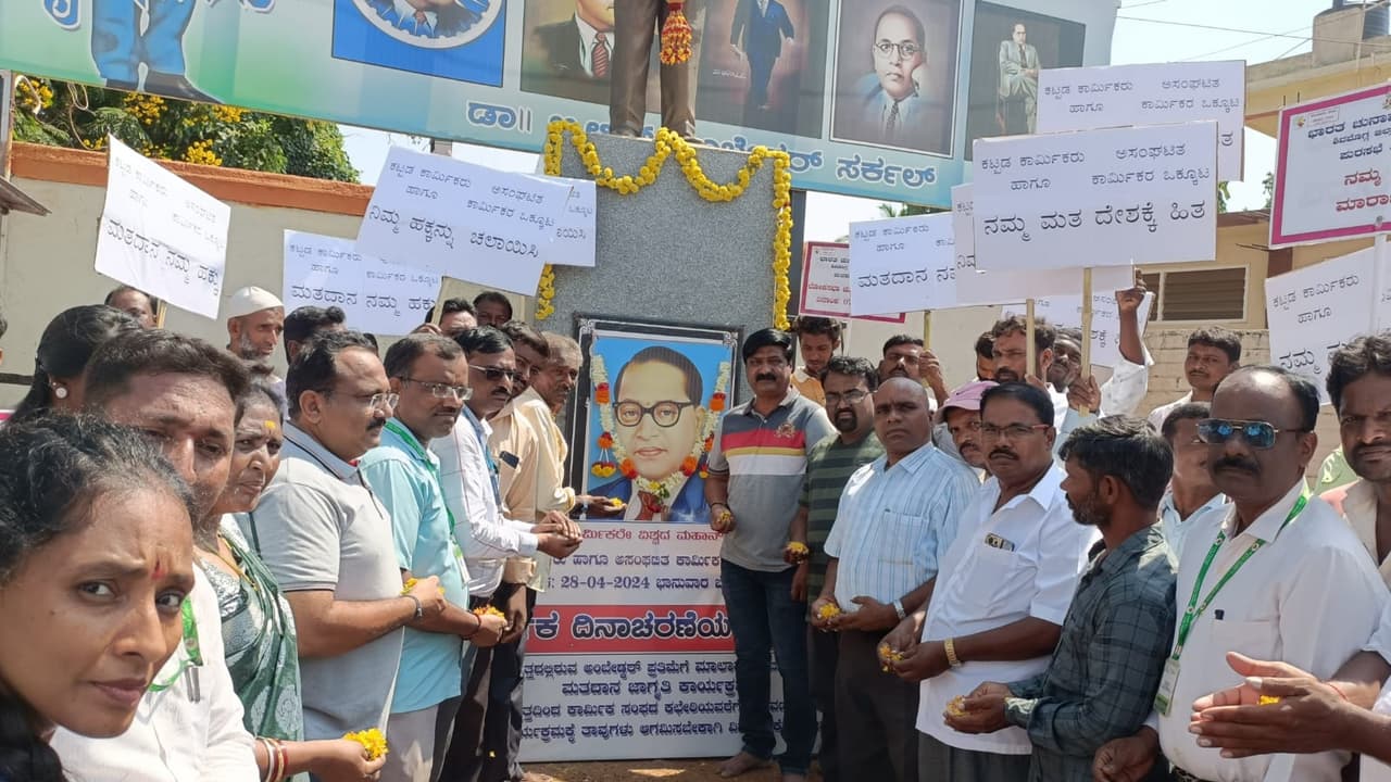 ಮತದಾನ ನಮ್ಮೆಲ್ಲರ ಜವಾಬ್ದಾರಿ ಹಾಗೂ ಸಂವಿಧಾನಿಕ ಹಕ್ಕಾಗಿದೆ ಇದನ್ನು ಎಲ್ಲರೂ ಚಲಾಯಿಸುವ ಮೂಲಕ ಸದೃಢ ದೇಶ ನಿರ್ಮಾಣಕ್ಕೆ ಪಾತ್ರರಾಗಬೇಕಾಗಿದೆ ಎಂದು ತಾಲೂಕು ದಂಡಾಧಿಕಾರಿ ಮಲ್ಲೇಶಪ್ಪ ಪೂಜಾರ್ ತಿಳಿಸಿದರು.ಅವರು ಪಟ್ಟಣದ ಅಂಬೇಡ್ಕರ್ ವೃತ್ತದಲ್ಲಿ ಅಸಂಘಟಿತ ಕಟ್ಟಡ ಕಾರ್ಮಿಕರ ಸಂಘ, ತಾಲೂಕು ಆಡಳಿತ, ಪುರಸಭೆ ಸಂಯುಕ್ತ ಆಶ್ರಯದಲ್ಲಿ ನಡೆದ ಮತದಾನ ಜಾಗೃತಿ ಅಭಿಯಾನ ಹಾಗೂ ಕಾರ್ಮಿಕ ದಿನಾಚರಣೆಗೆ ಚಾಲನೆ ನೀಡಿ ಮಾತನಾಡಿದರು.