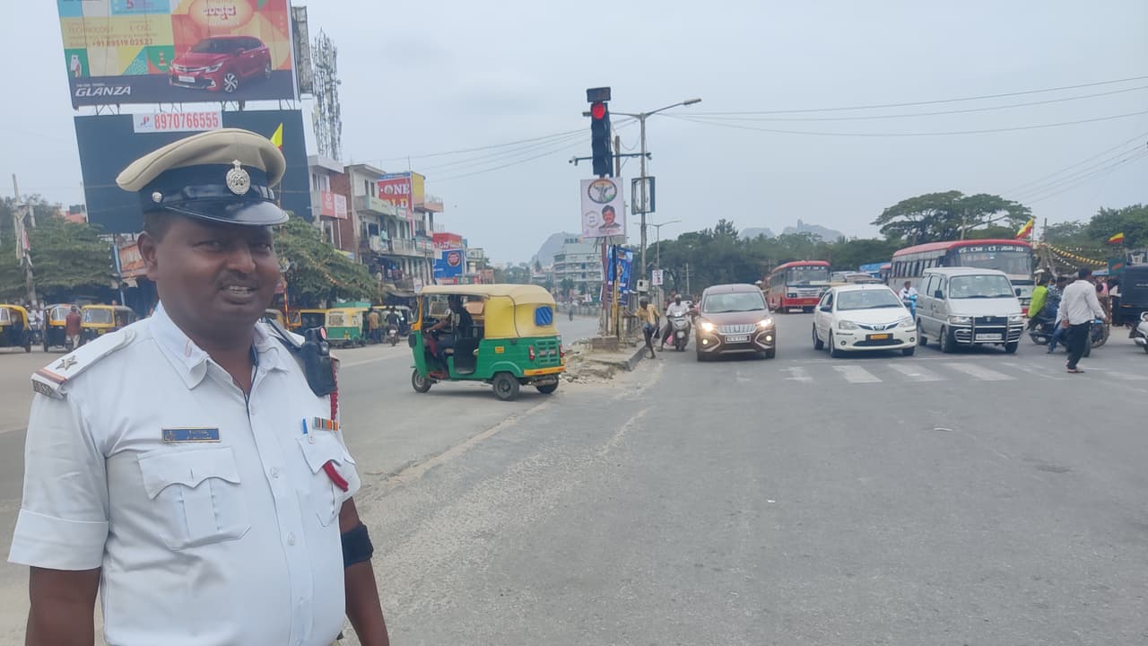 3.ರಾಮನಗರ ಸಂಚಾರಿ ಠಾಣೆಯ ಎಎಸ್ಸೈ ಕೆ.ಬೀರಯ್ಯರವರು ಬಾಡಿ ವೋರ್ನ್ ಕ್ಯಾಮೆರಾ ಅಳವಡಿಸಿಕೊಂಡು ಕರ್ತವ್ಯ ನಿರ್ವಹಿಸುತ್ತಿರುವುದು.4.ಬಾಡಿ ವೋರ್ನ್ ಕ್ಯಾಮೆರಾ