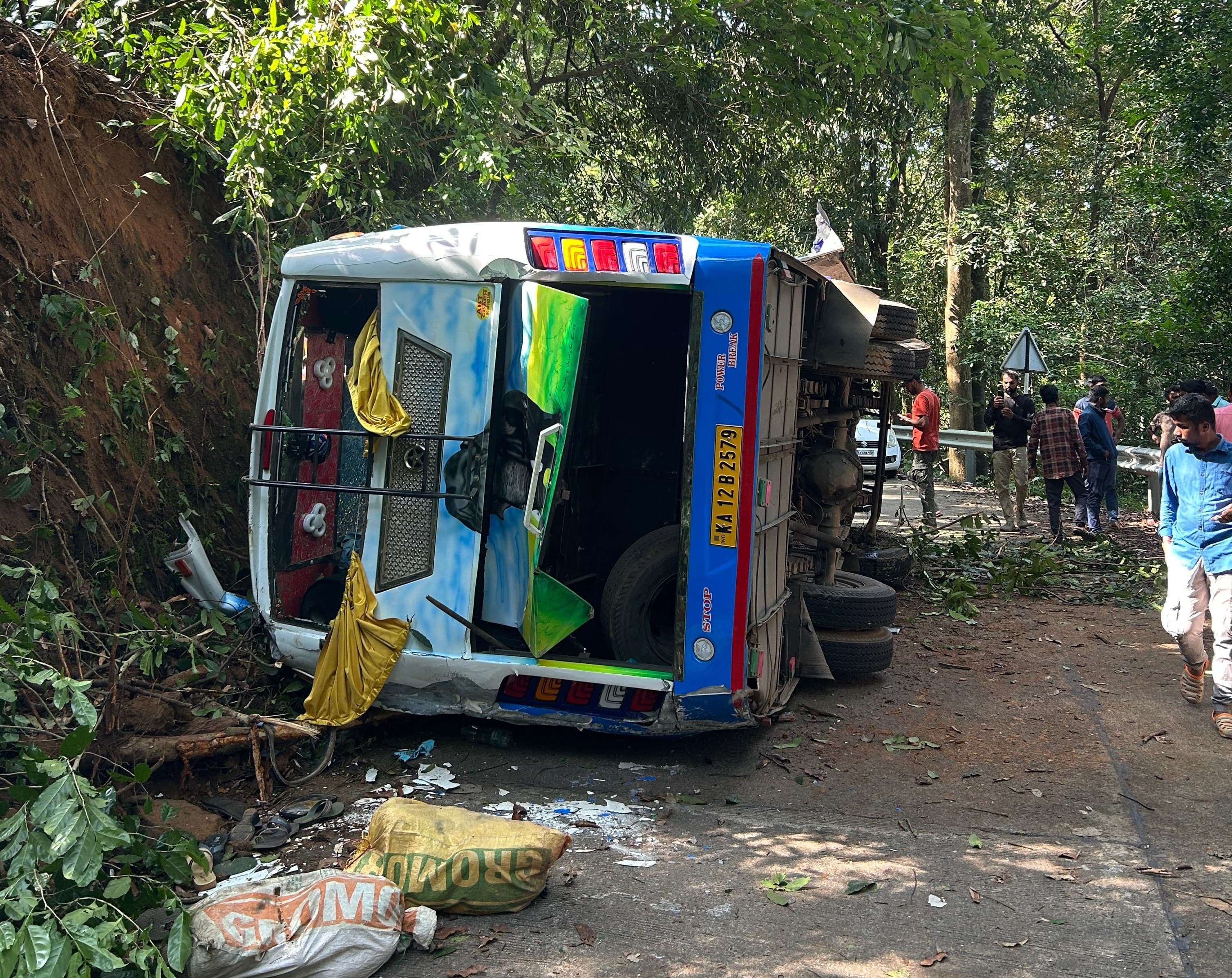 ಸುಬ್ರಹ್ಮಣ್ಯ: ಕುಕ್ಕೆ ಸುಬ್ರಹ್ಮಣ್ಯದಲ್ಲಿ ನಡೆಯುವ ಮದುವೆ ಕಾರ್ಯಕ್ರಮಕ್ಕೆ ಆಗಮಿಸುತ್ತಿದ್ದ ಮದುವೆಯ ವಾಹನ ಬಿಸ್ಲೆ ಘಾಟ್ ರಸ್ತೆಯ ತಿರುವಿನಲ್ಲಿ ಪಲ್ಟಿಯಾಗಿ ಓರ್ವ ಮೃತಪಟ್ಟು, ವಾಹನದಲ್ಲಿದ್ದ 20ಕ್ಕೂ ಅಧಿಕ ಮಂದಿ ಗಾಯಗೊಂಡ ಘಟನೆ ಗುರುವಾರ ಬೆಳಗ್ಗೆ ಸಂಭವಿಸಿದೆ.