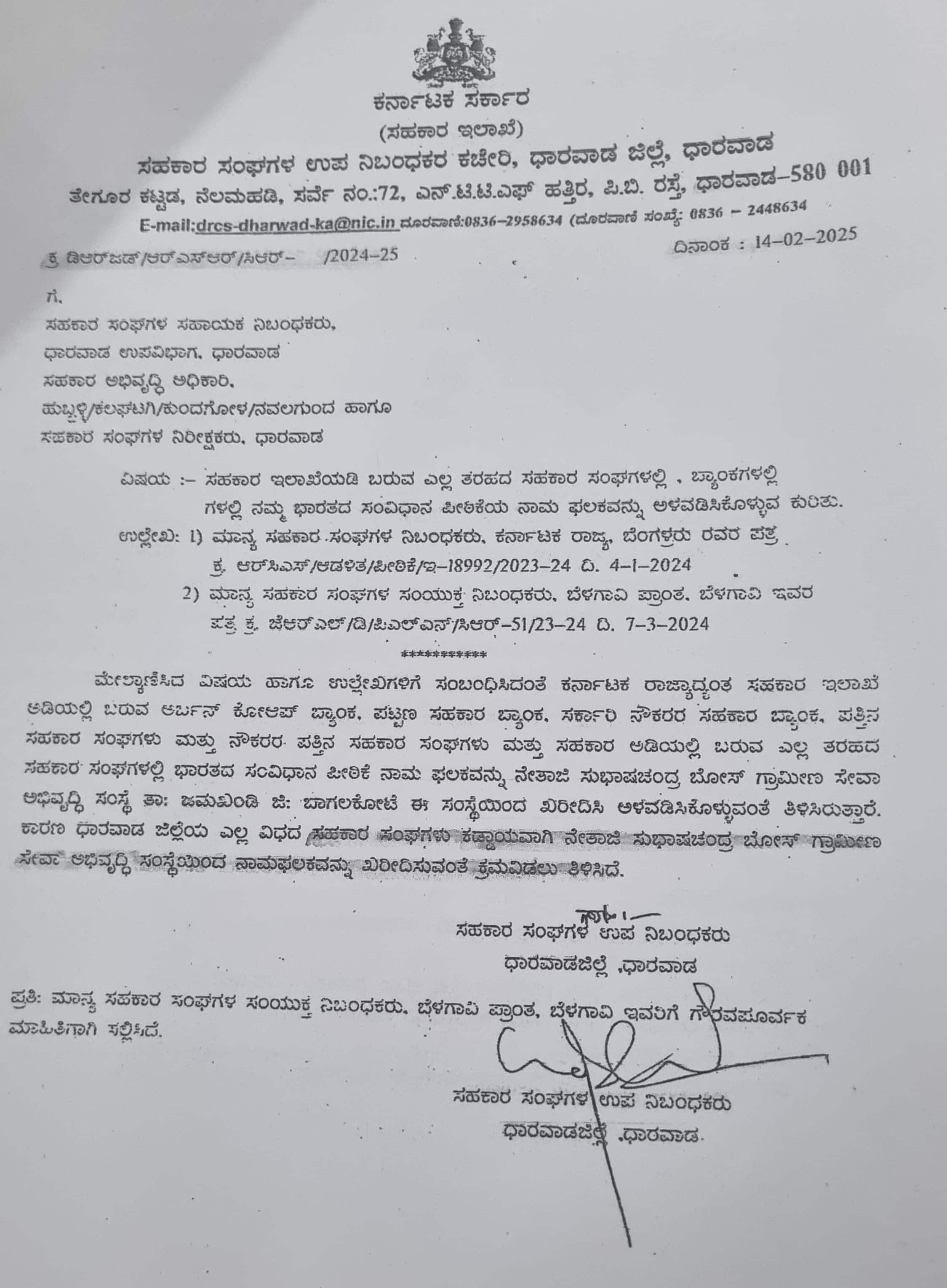 ಸಹಕಾರ ಇಲಾಖೆ ಅಡಿ ಬರುವ ಎಲ್ಲ ತರಹದ ಸಂಘ-ಸಂಸ್ಥೆಗಳು, ಬ್ಯಾಂಕ್ಗಳು ಕಡ್ಡಾಯವಾಗಿ ಇದೇ ಒಂದು ಸಂಸ್ಥೆಯಿಂದ ಸಂವಿಧಾನ ಪೀಠಿಕೆಯ ನಾಮಫಲಕ ಅಳವಡಿಸಬೇಕು ಎಂಬ ಸಹಕಾರಿ ಇಲಾಖೆಯ ಆದೇಶ ಇದೀಗ ಸಹಕಾರ ಕ್ಷೇತ್ರದಲ್ಲಿ ಸಂಚಲನ ಮೂಡಿಸಿದೆ.ಈಗಾಗಲೇ ಸರ್ಕಾರದ ಎಲ್ಲ ಇಲಾಖೆಗಳಲ್ಲಿ ಸಂವಿಧಾನ ಪೀಠಿಕೆ ಅಳವಡಿಸಿದ್ದು ಮುಂದುವರಿದ ಭಾಗವಾಗಿ ಸಹಕಾರ ಇಲಾಖೆ ಅಡಿಯಲ್ಲಿ ಬರುವ ಅರ್ಬನ್ ಕೋ ಆಪರೇಟಿವ್ ಬ್ಯಾಂಕ್, ಪಟ್ಟಣ ಸಹಕಾರಿ ಬ್ಯಾಂಕ್, ಸರ್ಕಾರಿ ನೌಕರರ ಸಹಕಾರಿ ಬ್ಯಾಂಕ್, ಪತ್ತಿನ ಸಹಕಾರಿ ಬ್ಯಾಂಕ್ ಮತ್ತು ಶಿಕ್ಷಕರ ಪತ್ತಿನ ಸಹಕಾರಿ ಬ್ಯಾಂಕ್ ಮತ್ತು ಫೈನಾನ್ಸ್ ಕಾರ್ಪೋರೇಶನ್ಗಳು ಸೇರಿದಂತೆ ಸಹಕಾರಿ ಇಲಾಖೆ ಅಡಿಯಲ್ಲಿ ಬರುವ ಎಲ್ಲ ತರಹದ ಸಂಘ-ಸಂಸ್ಥೆ, ಬ್ಯಾಂಕ್ಗಳು ಸಂವಿಧಾನ ಪೀಠಿಕೆಯ ನಾಮಫಲಕ ಅಳವಡಿಸಬೇಕು ಎಂದು ಸಹಕಾರ ಇಲಾಖೆ ಆದೇಶಿಸಿದೆ.
