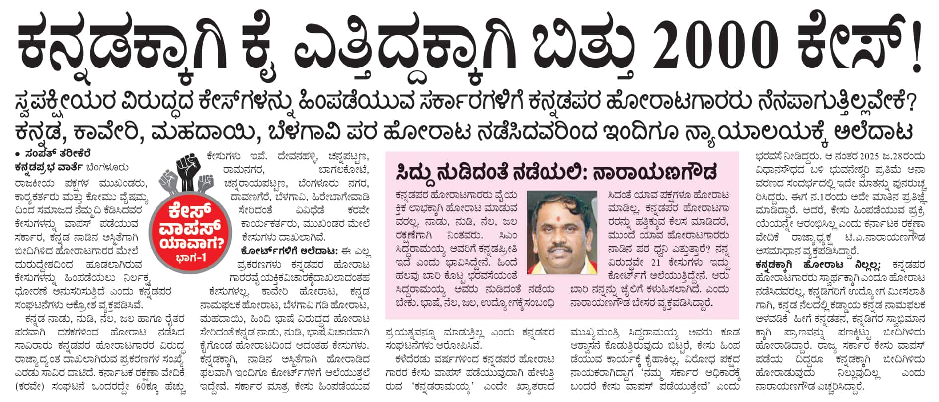ಕನ್ನಡಪರ ಹೋರಾಟಗಾರರ ಮೇಲೆ ದಾಖಲಾಗಿರುವ ಕೇಸುಗಳನ್ನು ಹಿಂಪಡೆಯಬೇಕೆಂಬ ‘ಕನ್ನಡಪ್ರಭ’ ಸರಣಿ ಅಭಿಯಾನದ ಕುರಿತು ಭಾನುವಾರ ಪ್ರತಿಕ್ರಿಯಿಸಿರುವ ಅವರು, ಯಾರು ಕಾನೂನಿನ ವಿರುದ್ಧವಾಗಿ ಕೆಲಸ ಮಾಡಿರುತ್ತಾರೋ ಅಂತಹವರ ಮೇಲೆ ಪೊಲೀಸರು ಕ್ರಮ ತೆಗೆದುಕೊಳ್ಳುತ್ತಾರೆ. ಕನ್ನಡಪರ, ರೈತಪರ ಸಂಘಟನೆಗಳು ಸೇರಿದಂತೆ ಯಾವುದೇ ಸಂಘಟನೆಗಳು ಒಳ್ಳೆಯ ಉದ್ದೇಶದಿಂದ ಹೋರಾಟ ಮಾಡಿದ ಸಂದರ್ಭದಲ್ಲಿ ಕೇಸು ದಾಖಲಾಗಿದ್ದರೆ, ಅವುಗಳನ್ನು ಪರಿಶೀಲಿಸಲು ಸಚಿವ ಸಂಪುಟ ಉಪಸಮಿತಿ ಮಾಡಲಾಗಿದೆ. ರಾಜ್ಯದ ಯಾವುದೇ ಪೊಲೀಸ್ ಠಾಣೆಯಲ್ಲಿ ಕೇಸು ಹಾಕಿದ್ದರೆ, ಅವುಗಳನ್ನು ಪರಿಶೀಲಿಸಿ ಸಮಿತಿ ವರದಿ ನೀಡುತ್ತದೆ. ಸಚಿವ ಸಂಪುಟ ಸಭೆಯಲ್ಲಿ ಚರ್ಚಿಸಿ ಅಗತ್ಯವಿದ್ದರೆ ಕೇಸು ವಾಪಸ್ ತೆಗೆದುಕೊಳ್ಳಲಾಗುವುದು ಎಂದರು.ಈಗ ಅರ್ಜಿ ನೀಡಿದರೆ ನಾಳೆಯೇ ವಾಪಸ್ ತೆಗೆದುಕೊಳ್ಳಲು ಆಗುವುದಿಲ್ಲ. ಎಲ್ಲವನ್ನೂ ಕೂಲಂಕಷವಾಗಿ ಚರ್ಚಿಸಿ, ಪರಿಶೀಲಿಸಿ, ಕ್ಯಾಬಿನೆಟ್ ತೀರ್ಮಾನ ತೆಗೆದುಕೊಳ್ಳುತ್ತದೆ. ಯಾವು ಕಾನೂನು ವಿರುದ್ಧವಾಗಿ ಕೆಲಸ ಮಾಡಿರುತ್ತಾರೋ ಅವರ ಮೇಲೆ ಕ್ರಮ ಆಗಲಿದೆ ಎಂದು ಹೇಳಿದರು.