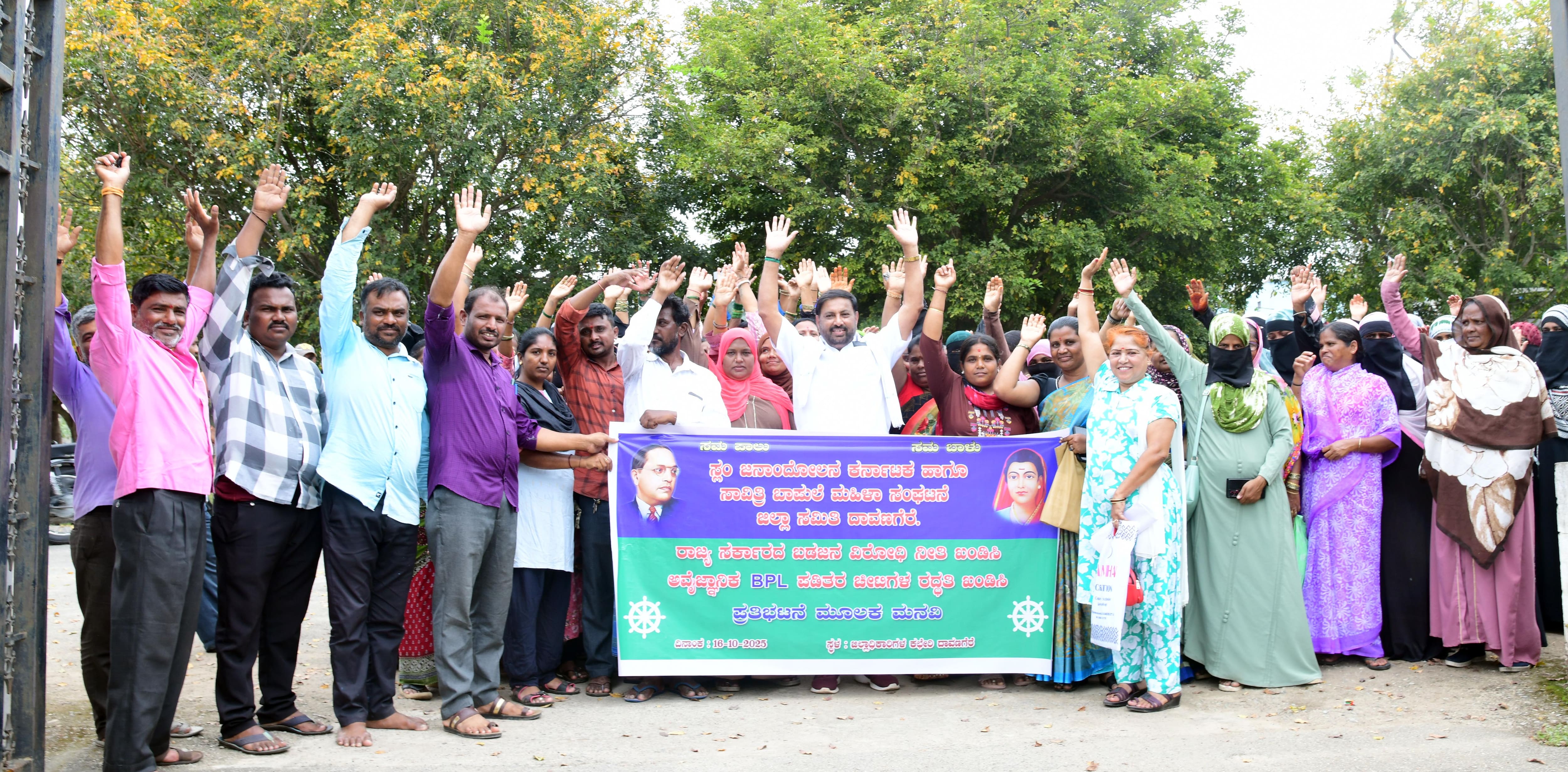 ರಾಜ್ಯಾದ್ಯಂತ ಬಡವರು, ಕೂಲಿ ಕಾರ್ಮಿಕರು ಹಾಗೂ ಸ್ಲಂ ಜನರ ಬಿಪಿಎಲ್ ಕಾರ್ಡ್ಗಳನ್ನು ರದ್ಧುಪಡಿಸಿದ ರಾಜ್ಯ ಸರ್ಕಾರದ ಜನವಿರೋಧಿ ಕ್ರಮ ಖಂಡಿಸಿ ಸ್ಲಂ ಜನಾಂದೋಲನ ಕರ್ನಾಟಕ, ಸಾವಿತ್ರಿ ಬಾಫುಲೆ ಮಹಿಳಾ ಸಂಘಟನೆ ಜಿಲ್ಲಾ ಘಟಕದಿಂದ ನಗರದಲ್ಲಿ ಪ್ರತಿಭಟಿಸಲಾಯಿತು.ನಗರದ ಜಿಲ್ಲಾಡಳಿತ ಭವನ ಎದುರು ಉಭಯ ಸಂಘಟನೆಗಳ ನೇತೃತ್ವದಲ್ಲಿ ಪ್ರತಿಭಟಿಸಿದ ಬಡವರು, ಜಿಲ್ಲಾ ಆಹಾರ ಇಲಾಖೆ ಅಧಿಕಾರಿಗಳ ಮುಖಾಂತರ ಮುಖ್ಯಮಂತ್ರಿಗೆ ಮನವಿ ರವಾನಿಸಿದರು.