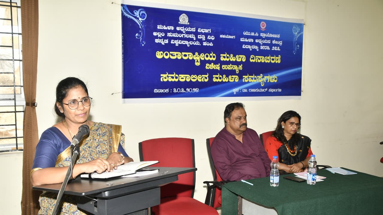 ಸರ್ಕಾರಿ ವಲಯದಲ್ಲಿ ಮಹಿಳೆಯರಿಗೆ ಸಮಾನ ಕೆಲಸಕ್ಕೆ ವೇತನ ದೊರೆತರೂ ಅತಿಹೆಚ್ಚು ಮಹಿಳೆಯರು ಭಾಗವಹಿಸುವ ಖಾಸಗಿ ಕ್ಷೇತ್ರದಲ್ಲಿ ವೇತನದ ಅಸಮಾನತೆಯನ್ನು ಕಾಣಬಹುದು. ಮಹಿಳೆಯು ಸ್ವಾವಲಂಬಿಯಾಗಲು ಉದ್ಯಮಶೀಲತೆಯಲ್ಲಿ ತೊಡಗಿಸಿಕೊಳ್ಳಬೇಕು. ಇದಕ್ಕೆ ಮಹಿಳೆಯರಿಗೆ ಪರಿಪೂರ್ಣ ಕೌಶಲ್ಯದ ಅಗತ್ಯವಿದೆ. ಮಹಿಳೆ ಕೆಲಸ ಮಾಡುವ ಸ್ಥಳದಲ್ಲಿ ದೈಹಿಕವಾಗಿ ಮತ್ತು ಮಾನಸಿಕವಾಗಿ ಕಿರುಕುಳಕ್ಕೆ ಒಳಗಾಗುತ್ತಿದ್ದಾಳೆ. ಬಾಲ್ಯವಿವಾಹ, ಒತ್ತಾಯದ ಮದುವೆ, ಭ್ರೂಣ ಹತ್ಯೆ, ವಿವಾಹ ವಿಚ್ಛೇದನ, ಒತ್ತಾಯದ ಗರ್ಭಪಾತದಂತಹ ಗಂಭೀರ ಸಮಸ್ಯೆಗಳನ್ನು ಎದುರಿಸುತ್ತಿದ್ದಾಳೆ. ಆತಂಕಕಾರಿಯಾದ ವಿಷಯ. ಮಹಿಳೆಗೆ ತನ್ನ ದೇಹ ತನ್ನ ಹಕ್ಕು ಎಂಬುದು ಮೂಲಭೂತವಾದ ಹಕ್ಕಾಗಬೇಕು. ಮಹಿಳೆಯರು ಹೆಚ್ಚು ಶಿಕ್ಷಿತರಾದಾಗ ಮಾತ್ರ ಈ ಎಲ್ಲಾ ಸಮಸ್ಯೆಗಳಿಗೂ ಪರಿಹಾರ ಸಾಧ್ಯವಾಗುತ್ತದೆ ಎಂದರು.ಕನ್ನಡ ವಿವಿಯ ಕುಲಸಚಿವ ಡಾ.ವಿಜಯ್ ಪೂಣಚ್ಚ ತಂಬಂಡ ಅಧ್ಯಕ್ಷತೆ ವಹಿಸಿ ಮಾತನಾಡಿದರು. ಮಹಿಳೆಯರ ಸಮಸ್ಯೆಗಳು ಇಂದಿಗೂ ಪರಿಹಾರವಾಗದೇ ನಮ್ಮೆದುರು ಪ್ರಶ್ನೆಗಳಾಗಿಯೇ ಉಳಿದುಬಿಟ್ಟಿವೆ. ಮಹಿಳಾ ಕಿರುಕುಳ ಎಂದರೆ ಕೇವಲ ಲೈಂಗಿಕ ಕಿರುಕುಳ ಎಂಬುವಂತಹ ವಾತಾವರಣ ನಿರ್ಮಾಣವಾಗಿದೆ. ಆದರೆ ಅದರಾಚೆಗೂ ಶಿಕ್ಷಣ, ವೇತನ, ಮುಖ್ಯವಾಹಿನಿಯಲ್ಲಿ ಭಾಗವಹಿಸುವಿಕೆಯಂತಹ ಹಲವು ಸಮಸ್ಯೆಗಳನ್ನು ಎದುರಿಸುತ್ತಿದ್ದಾರೆ ಎಂದರು.