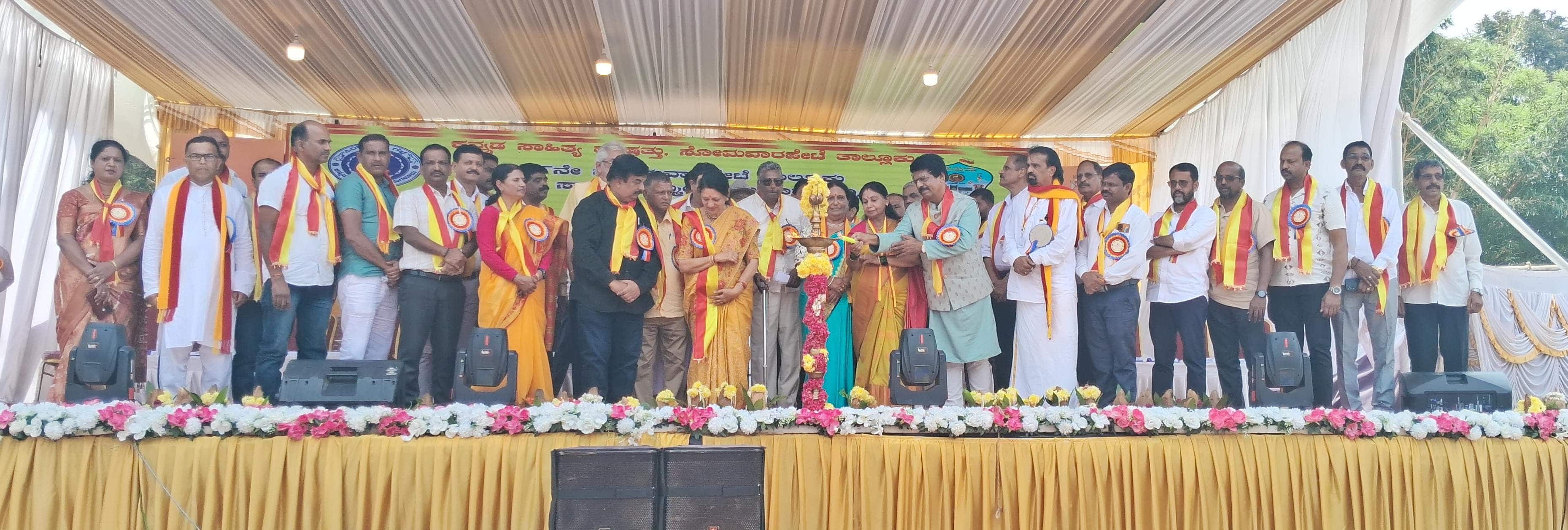 ಸಾಂಪ್ರದಾಯಿಕ ವಾದ್ಯಗಳು, ಜನಪದ ಕಲಾವಿದರ ನೃತ್ಯ, ಕನ್ನಡ ಧ್ವಜಗಳು ಮತ್ತು ಘೋಷಣೆಗಳೊಂದಿಗೆ ನಡೆದ ಮೆರವಣಿಗೆಗೆ ಗ್ರಾಮಸ್ಥರು ಸಾಕ್ಷಿಯಾದರು. ತಾಪಂ ಕಾರ್ಯನಿರ್ವಾಹಕ ಅಧಿಕಾರಿ ಪರಮೇಶ ಕುಮಾರ್ ಮೆರವಣಿಗೆಯನ್ನು ಉದ್ಘಾಟಿಸಿದರು. ಕಬ್ಬಿಣ ಸೇತುವೆಯಿಂದ ಯಡವಾರೆ ಮಾರ್ಗವಾಗಿ ಸರ್ಕಾರಿ ಕಾಲೇಜು ಮೂಲಕ ಸಭಾಂಗಣದವರೆಗೆ ಮೆರವಣಿಗೆ ಸಾಗಿತು.ಬೆಳಗ್ಗೆ ೬.೩೦ ಗಂಟೆಗೆ ಶಾಲಾ ಮೈದಾನದಲ್ಲಿ ತಾಲೂಕು ತಹಸೀಲ್ದಾರ್ ಕೆ.ಕೆ. ಕೃಷ್ಣಮೂರ್ತಿ ಧ್ವಜಾರೋಹಣ ನೆರವೇರಿಸುವ ಮೂಲಕ ಅಧಿಕೃತ ಚಾಲನೆ ನೀಡಿದರು. ನಂತರ ಕನ್ನಡ ಸಾಹಿತ್ಯ ಪರಿಷತ್ ಜಿಲ್ಲಾ ಅಧ್ಯಕ್ಷ ಎಂ.ಪಿ. ಕೇಶವ ಕಾಮತ್ ಕನ್ನಡ ಧ್ವಜಾರೋಹಣ ನೆರವೇರಿಸಿದರು.ದ್ವಾರಗಳ ಉದ್ಘಾಟನೆ: