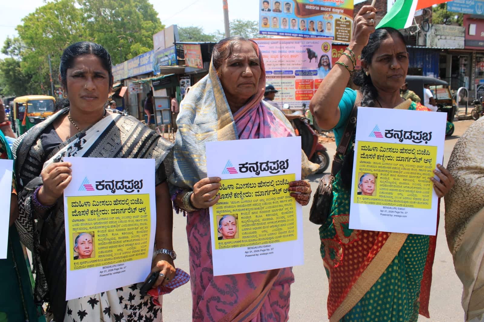 ಮಹಿಳಾ ಮೀಸಲಾತಿ ವಿಷಯದಲ್ಲಿ ಬಿಜೆಪಿ ಸರ್ಕಾರದ ದ್ವಂದ್ವ ನೀತಿ ಖಂಡಿಸಿ ಮಹಿಳಾ ಕಾಂಗ್ರೆಸ್ ಕಾರ್ಯಕರ್ತರು ಪ್ರತಿಭಟನೆ ನಡೆಸುವ ವೇಳೆ ಕನ್ನಡಪ್ರಭದಲ್ಲಿ ಮಹಿಳಾ ಮೀಸಲಾತಿ ಕುರಿತು ಮಾರ್ಗರೆಟ್ ಆಳ್ವ ನೀಡಿರುವ ಹೇಳಿಕೆಯ ವರದಿಯನ್ನು ಹಿಡಿದುಕೊಂಡು ಪ್ರತಿಭಟಿಸಿದರು