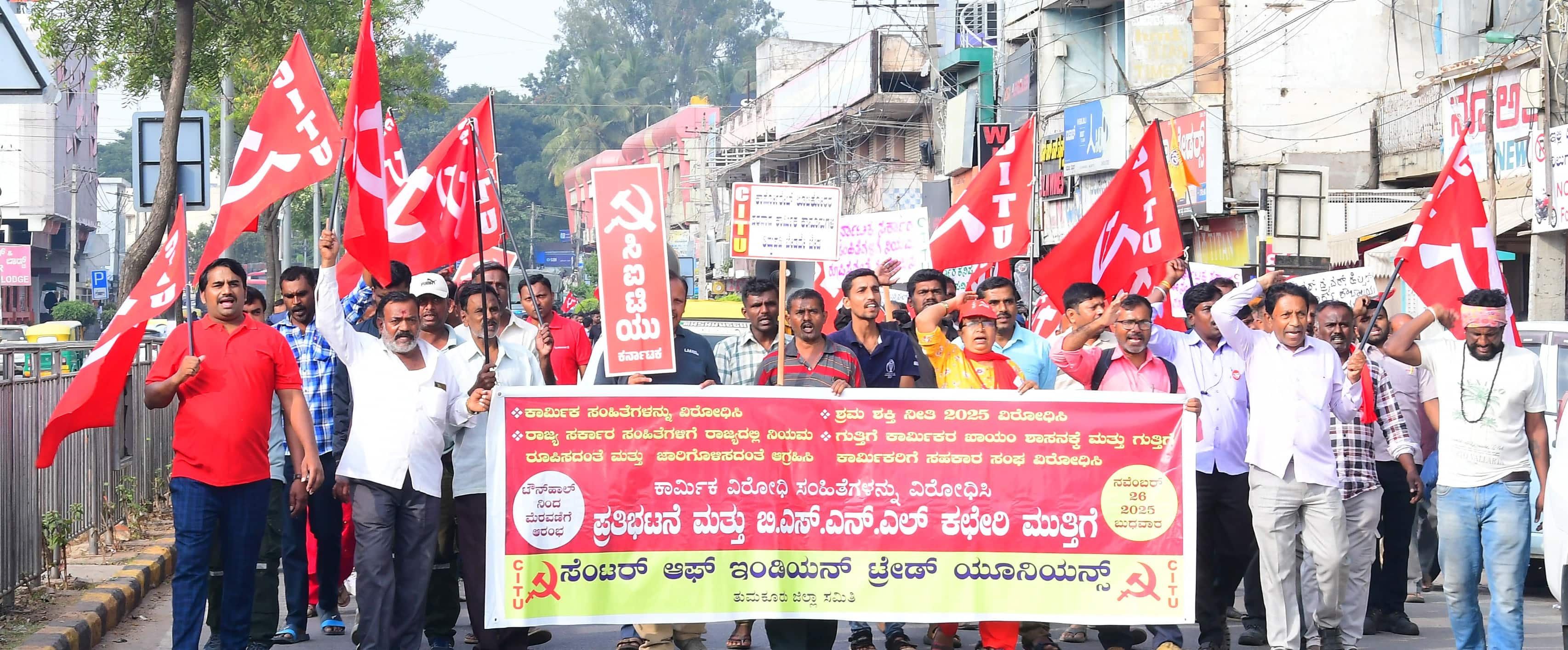 ಜಿಲ್ಲಾ ಖಜಾಂಚಿ ಎ. ಲೋಕೇಶ್ ಮಾತನಾಡಿ 21 ನವೆಂಬರ್ 2025 ರಂದು ಜಾರಿಮಾಡಲಾದ ನಾಲ್ಕು ಕಾರ್ಮಿಕ ಸಂಹಿತೆಗಳ ಈ ನಿರಂಕುಶ ಮತ್ತು ಅಪ್ರಜಾಸತ್ತಾತ್ಮಕ ಕ್ರಮವಾಗಿದೆ. ಈ ನಡೆಯು ನಮ್ಮ ದೇಶ ಭಾರತದ ಕಲ್ಯಾಣ ರಾಜ್ಯದ ಸ್ವರೂಪವನ್ನು ಧ್ವಂಸಗೊಳಿಸುತ್ತದೆ ಎಂದರು. ಸುಜೀತ್ ನಾಯಕ್ ಮಾತನಾಡಿ, ರಾಜ್ಯ ಸರ್ಕಾರ ಈ ಕೂಡಲೆ ಮಾಸಿಕ 36 ಸಾವಿರ ಕನಿಷ್ಟ ವೇತನವನ್ನು ಜಾರಿಗೊಳಿಸಬೇಕು. ಗುತ್ತಿಗೆ ಕಾರ್ಮಿಕರ ಖಾಯಂಮಾತಿಗಾಗಿ ಶಾಸನ ಒಂದನ್ನು ರೂಪಿಸಬೇಕು. ಗುತ್ತಿಗೆ ಕಾರ್ಮಿಕರ ಸೇವೆಗಳನ್ನು ಖಾಯಂ ಮಾಡುವ ಬದಲು ಸಹಕಾರ ಸಂಘ ರಚಿಸುವ ನಡೆ ಒಪ್ಪಲಾಗದು ಎಂದರು. ಸಿಐಟಿಯು ಜಿಲ್ಲಾ ಪ್ರಧಾನ ಕಾರ್ಯದರ್ಶಿ ಜಿ. ಕಮಲ, ಶಿವಕುಮಾರ್ ಸ್ವಾಮಿ, ಉಮೇಶ್, ಮಾರುತಿ. ಮಂಜುನಾಥ, ಲಿಂಗೇಶ್, ಮುತ್ತುರಾಜು, ಮಂಜುನಾಥ, ಸುಬ್ರಮಣ್ಯ, ಕಲ್ಪನಾ ಇತರರಿದ್ದರು.