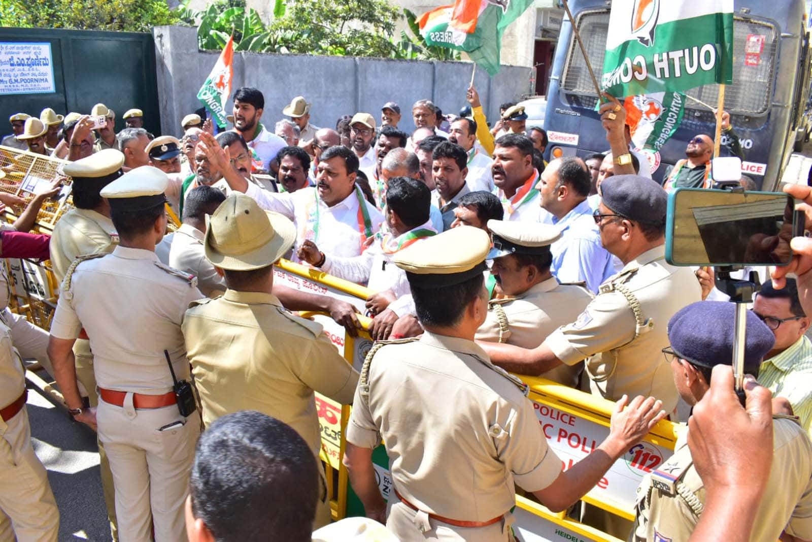 ನಗರದ ಬಂದೀಗೌಡ ಬಡಾವಣೆಯಲ್ಲಿರುವ ಕಾಂಗ್ರೆಸ್ ಕಚೇರಿಯಿಂದ ಜಿಲ್ಲಾ ಕಾಂಗ್ರೆಸ್ ಕಾರ್ಯಾಧ್ಯಕ್ಷ ಎಂ.ಎಸ್. ಚಿದಂಬರ್ ನೇತೃತ್ವದಲ್ಲಿ ಸುಭಾಷ್ ನಗರದಲ್ಲಿರುವ ಬಿಜೆಪಿ ಕಚೇರಿವರೆಗೆ ಮೆರವಣಿಗೆ ನಡೆಸಿದ ಕಾಂಗ್ರೆಸ್ ಕಾರ್ಯಕರ್ತರು, ಬಿಜೆಪಿ ಕಚೇರಿಗೆ ನುಗ್ಗಲು ಯತ್ನಿಸಿದರು. ಸ್ಥಳದಲ್ಲಿದ್ದ ಪೊಲೀಸರು ಬ್ಯಾರಿಕೇಡ್ ಹಾಕಿ ಪ್ರತಿಭಟನಾಕಾರರನ್ನು ತಡೆದು ವಶಕ್ಕೆ ಪಡೆದು ಜಿಲ್ಲಾ ಸಶಸ್ತ್ರ ಮೀಸಲು ಪಡೆ ವಾಹನದಲ್ಲಿ ಕರೆದೊಯ್ದರು.