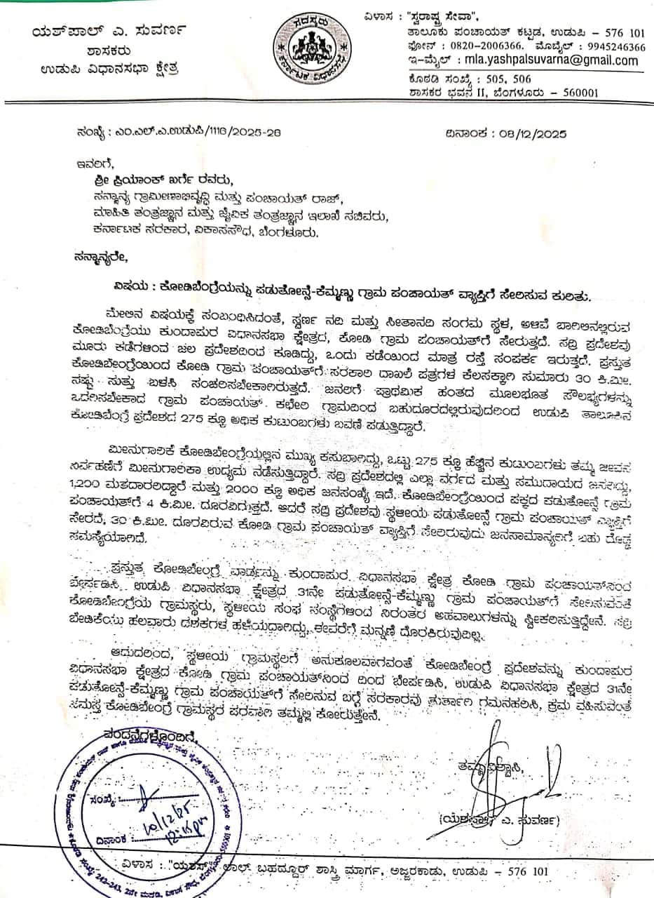 ಉಡುಪಿ: ಕುಂದಾಪುರ ವಿಧಾನಸಭಾ ಕ್ಷೇತ್ರದ ಕೋಡಿ ಗ್ರಾಪಂ ವ್ಯಾಪ್ತಿಯಲ್ಲಿರುವ ಕೋಡಿಬೆಂಗ್ರೆ ಭಾಗವನ್ನು ಸ್ಥಳೀಯ ಜನತೆಯ ಬೇಡಿಕೆಯಂತೆ ಉಡುಪಿ ವಿಧಾನಸಭಾ ಕ್ಷೇತ್ರದ ಕೆಮ್ಮಣ್ಣು ಗ್ರಾಪಂ ಗೆ ಸೇರಿಸುವಂತೆ ಉಡುಪಿ ಶಾಸಕ ಯಶ್ಪಾಲ್ ಸುವರ್ಣ ಅವರು ಗ್ರಾಮೀಣಾಭಿವೃದ್ಧಿ ಮತ್ತು ಪಂಚಾಯತ್ ರಾಜ್ ಸಚಿವ ಪ್ರಿಯಾಂಕ್ ಖರ್ಗೆ ಅವರಿಗೆ ಪತ್ರ ಬರೆದು ಮನವಿ ಮಾಡಿದ್ದಾರೆ.