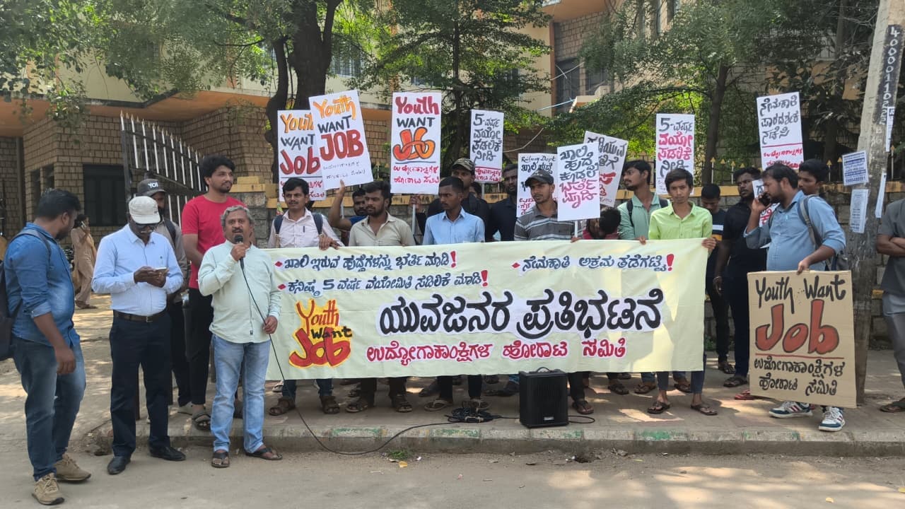 ನಗರದಲ್ಲಿ ಪ್ರತಿಭಟನಾಕಾರರನ್ನುದ್ದೇಶಿಸಿ ಮಾತನಾಡಿದ ಸಾಹಿತಿ ಪೀರ್ ಬಾಷಾ, ಪ್ರಧಾನಿ ನರೇಂದ್ರ ಮೋದಿ ಮತ್ತು ಮುಖ್ಯಮಂತ್ರಿ ಸಿದ್ದರಾಮಯ್ಯ ಅವರಿಗೆ ವಿವೇಕ ಮತ್ತು ನ್ಯಾಯಪ್ರಜ್ಞೆ ಇದ್ದರೆ ಕೂಡಲೇ ಯುವಕರ ಸಮಸ್ಯೆ ಅರ್ಥ ಮಾಡಿಕೊಂಡು ನೇಮಕಾತಿಗೆ ಮುಂದಾಗಬೇಕು. ಖಾಲಿ ಹುದ್ದೆಗಳನ್ನು ಭರ್ತಿಮಾಡಿಕೊಂಡರೆ ಮಾತ್ರ ಪಾರ್ಲಿಮೆಂಟ್, ವಿಧಾನಸೌಧಗಳಲ್ಲಿ ಹೇಳುವ ‘ಪ್ರಜಾಪ್ರಭುತ್ವ’ ಎನ್ನುವ ಪದಕ್ಕೆ ಅರ್ಥ ಬರುತ್ತದೆ. ಕೆಲಸ ಮಾಡುವುದನ್ನು ಬಿಟ್ಟು ಮಾತನಾಡಿದರೆ, ಬೊಗಳೆ ಮಾತಾಗುತ್ತದೆ. ಯುವಕರಿಗೆ ಈಗ ಬೊಗಳೆ ಮಾತು ಸಾಕಾಗಿದೆ ಎಂದು ಆಕ್ರೋಶವ್ಯಕ್ತ ಪಡಿಸಿದರು.ಉದ್ಯೋಗಾಕಾಂಕ್ಷಿಗಳ ಹೋರಾಟ ಸಮಿತಿಯ ಯರಿಸ್ವಾಮಿ ಮಾತನಾಡಿ, ರಾಜ್ಯದ 43 ಇಲಾಖೆಗಳಲ್ಲಿ 2,84,881 ಹುದ್ದೆಗಳು ಖಾಲಿ ಬಿದ್ದಿವೆ. ಈ ಹಿಂದೆ ಅಧಿಕಾರ ನಡೆಸಿದ ಬಿಜೆಪಿ ಸರ್ಕಾರ ಖಾಲಿ ಹುದ್ದೆಗಳ ಭರ್ತಿಗೆ ಕೋವಿಡ್ ಕಾರಣ ಹೇಳಿ ಯಾವುದೇ ಪ್ರಯತ್ನ ಮಾಡಲಿಲ್ಲ. ಬಿಜೆಪಿ ಆಡಳಿತದ ವೈಫಲ್ಯಗಳನ್ನು ಎತ್ತಿ ತೋರಿಸುತ್ತಾ ಕಾಂಗ್ರೆಸ್ ಪಕ್ಷ; ತಾನು ಅಧಿಕಾರಕ್ಕೆ ಬಂದರೆ ಎಲ್ಲ ಖಾಲಿ ಹುದ್ದೆಗಳನ್ನು ಭರ್ತಿ ಮಾಡುವ ಭರವಸೆ ನೀಡಿತ್ತು. ಆದರೆ, ಅಧಿಕಾರಕ್ಕೆ ಬಂದು 2 ವರ್ಷ 4 ತಿಂಗಳು ಕಳೆದರೂ ಒಳಮೀಸಲಾತಿ ಹೆಸರಿನಲ್ಲಿ ಯಾವುದೇ ನೇಮಕಾತಿ ಮಾಡಿಲ್ಲ. ತಾನು ನೀಡಿದ ಉದ್ಯೋಗದ ಗ್ಯಾರಂಟಿಯನ್ನು ಅಧಿಕಾರಕ್ಕೆ ಬಂದ ನಂತರ ಕಾರ್ಯ ರೂಪಕ್ಕೆ ತರುವುದೆಂದು ಯುವಜನತೆ ನಿರೀಕ್ಷೆಯಲ್ಲಿದ್ದರು. ಆದರೆ, ಅವರ ನಿರೀಕ್ಷೆ ಹುಸಿಯಾಗಿದೆ. ಯುವಕರು ಬಲಿಷ್ಠ-ಪ್ರಜತಾಂತ್ರಿಕ ಹೋರಾಟಕ್ಕೆ ಮುಂದಾಗ ಬೇಕಾದ ಕಾಲ ಬಂದಿದೆ ಎಂದರು.