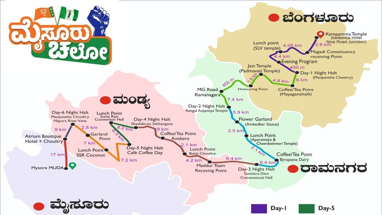 ಮೊದಲ ದಿನ ಶನಿವಾರ ಕೆಂಗೇರಿಯಿಂದ ಬಿಡದಿವರೆಗೆ ಯಾತ್ರೆ ಸಾಗಲಿದೆ. ಎರಡನೇ ದಿನ ಆ.4ರಂದು ಬಿಡದಿಯಿಂದ ರಾಮನಗರದವರೆಗೆ, ಆ.5ರಂದು ರಾಮನಗರದಿಂದ ಚನ್ನಪಟ್ಟಣದವರೆಗೆ, ಆ.6ರಂದು ಚನ್ನಪಟ್ಟಣದಿಂದ ಮದ್ದೂರಿನವರೆಗೆ, ಆ.7ರಂದು ಮದ್ದೂರಿನಿಂದ ಮಂಡ್ಯದವರೆಗೆ, ಆ.8ರಂದು ಮಂಡ್ಯದಿಂದ ಶ್ರೀರಂಗಪಟ್ಟಣದವರೆಗೆ ಹಾಗೂ ಆ.9ರಂದು ಶ್ರೀರಂಗಪಟ್ಟಣದಿಂದ ಮೈಸೂರಿನವರೆಗೆ ಸಂಚರಿಸಲಿದೆ.