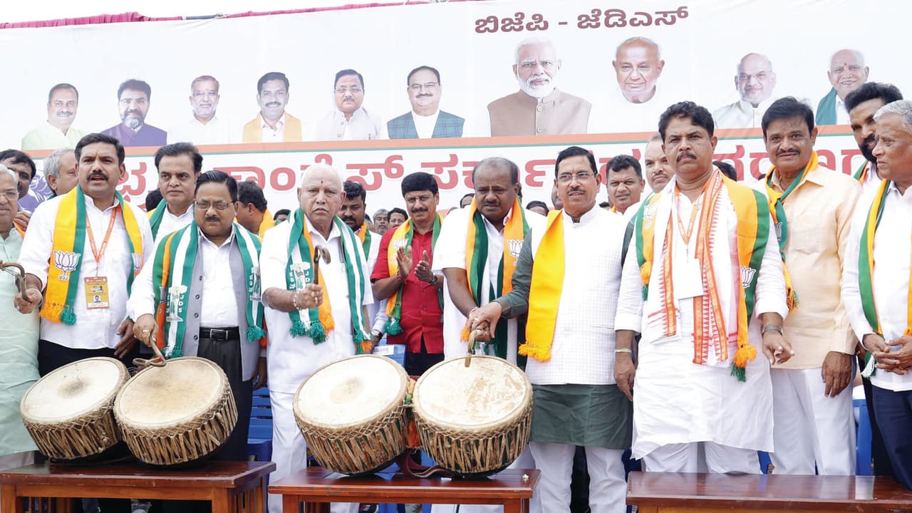ಮಾಜಿ ಮುಖ್ಯಮಂತ್ರಿ ಬಿ.ಎಸ್.ಯಡಿಯೂರಪ್ಪ, ಬಿಜೆಪಿ ರಾಜ್ಯಾಧ್ಯಕ್ಷ ಬಿ.ವೈ.ವಿಜಯೇಂದ್ರ, ಬಿಜೆಪಿ ರಾಜ್ಯ ಉಸ್ತುವಾರಿ ರಾಧಾ ಮೋಹನ್ ದಾಸ್ ಅಗರ್ವಾಲ್, ಜೆಡಿಎಸ್ ರಾಜ್ಯಾಧ್ಯಕ್ಷರೂ ಆಗಿರುವ ಕೇಂದ್ರದ ಭಾರಿ ಕೈಗಾರಿಕಾ ಸಚಿವ ಎಚ್.ಡಿ.ಕುಮಾರಸ್ವಾಮಿ, ವಿಧಾನಸಭೆ ಪ್ರತಿಪಕ್ಷ ನಾಯಕ ಆರ್.ಅಶೋಕ್, ಕೇಂದ್ರ ಆಹಾರ ಮತ್ತು ಪೂರೈಕೆ ಸಚಿವ ಪ್ರಹ್ಲಾದ್ ಜೋಶಿ ಸೇರಿದಂತೆ ಬಿಜೆಪಿ-ಜೆಡಿಎಸ್ನ ಇತರ ಮುಖಂಡರೆಲ್ಲರೂ ದೀಪ ಬೆಳಗಿಸಿ, ನಗಾರಿ ಬಾರಿಸುವ ಮೂಲಕ ಪಾದಯಾತ್ರೆಗೆ ಚಾಲನೆ ನೀಡಿದರು.