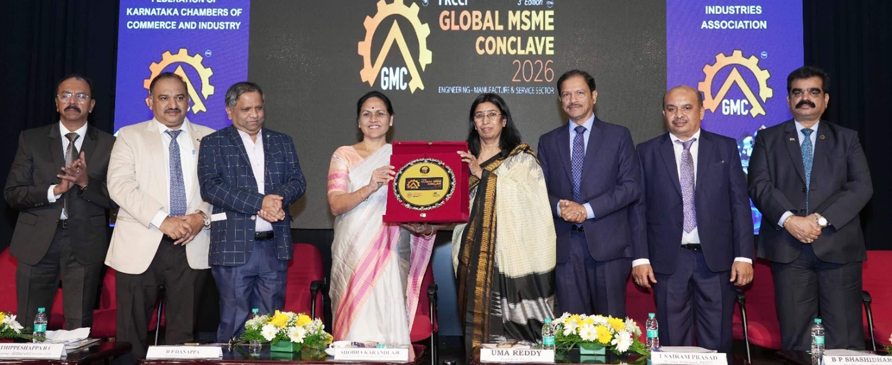 ರಾಜ್ಯದ ಸಣ್ಣ ಕೈಗಾರಿಕೆಗಳು ಜಾಗತಿಕ ಮಟ್ಟದಲ್ಲಿ ಗುರುತಿಸಿಕೊಳ್ಳುವಷ್ಟರ ಮಟ್ಟಿಗೆ ಅಭಿವೃದ್ಧಿ ಸಾಧಿಸಬೇಕು. ಕೇಂದ್ರ ಸರ್ಕಾರ ಎಂಎಸ್ಎಂಇ ಅಭಿವೃದ್ಧಿಗೆ ಸಂಪೂರ್ಣ ಸಹಕಾರ ನೀಡಲಿದೆ ಎಂದು ಕೇಂದ್ರ ಸಚಿವೆ ಶೋಭಾ ಕರಂದ್ಲಾಜೆ ಭರವಸೆ ನೀಡಿದರು.ಶನಿವಾರ ಕರ್ನಾಟಕ ವಾಣಿಜ್ಯ ಮತ್ತು ಕೈಗಾರಿಕಾ ಮಹಾಸಂಸ್ಥೆ (ಎಫ್ಕೆಸಿಸಿಐ) ಹಾಗೂ ಪೀಣ್ಯ ಕೈಗಾರಿಕಾ ಸಂಘದ ಸಹಯೋಗದಲ್ಲಿ ಎಫ್ಕೆಸಿಸಿಐ ಸಭಾಂಗಣದಲ್ಲಿ ಆಯೋಜಿಸಿದ್ದ ಕಾರ್ಯಕ್ರಮದಲ್ಲಿ ಗ್ಲೋಬಲ್ ಎಂಎಸ್ಎಂಇ ಕಾನ್ಕ್ಲೇವ್ 2026 ಲೋಗೋ ಅನಾವರಣಗೊಳಿಸಿ ಮಾತನಾಡಿದರು.