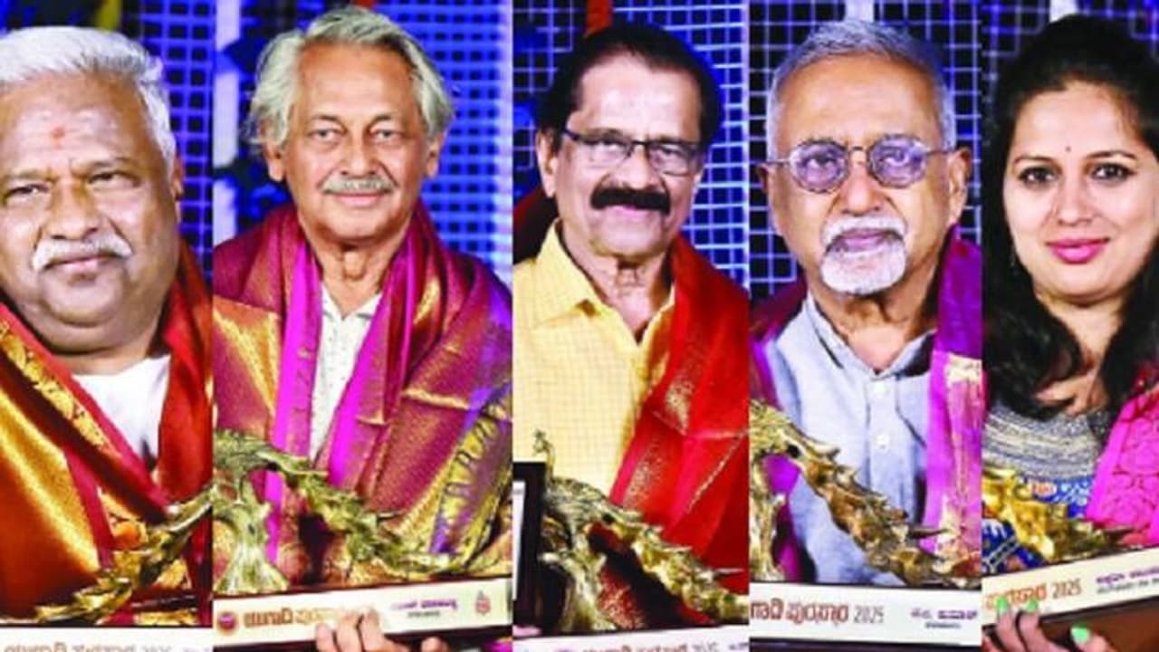 ಪಂಡಿತ್ ಎಂ. ವೆಂಕಟೇಶ್ ಕುಮಾರ್, ಹಿರಿಯ ಕವಿ ಬಿ.ಆರ್.ಲಕ್ಷ್ಮಣರಾವ್, ಗಿರೀಶ್ ಕಾಸರವಳ್ಳಿ, ಚಿತ್ರಕಲಾವಿದ ಪ.ಸ.ಕುಮಾರ್ ಹಾಗೂ ನಟಿ ಅಕ್ಷತಾ ಪಾಂಡವಪುರ ಅವರು 2025ನೇ ಸಾಲಿನ ‘ಕನ್ನಡಪ್ರಭ’ ಹಾಗೂ ‘ಏಷ್ಯಾನೆಟ್ ಸುವರ್ಣ ನ್ಯೂಸ್’ ಯುಗಾದಿ ಸಂಭ್ರಮದ ‘ಯುಗಾದಿ ಪುರಸ್ಕಾರ’ಕ್ಕೆ ಭಾಜನ