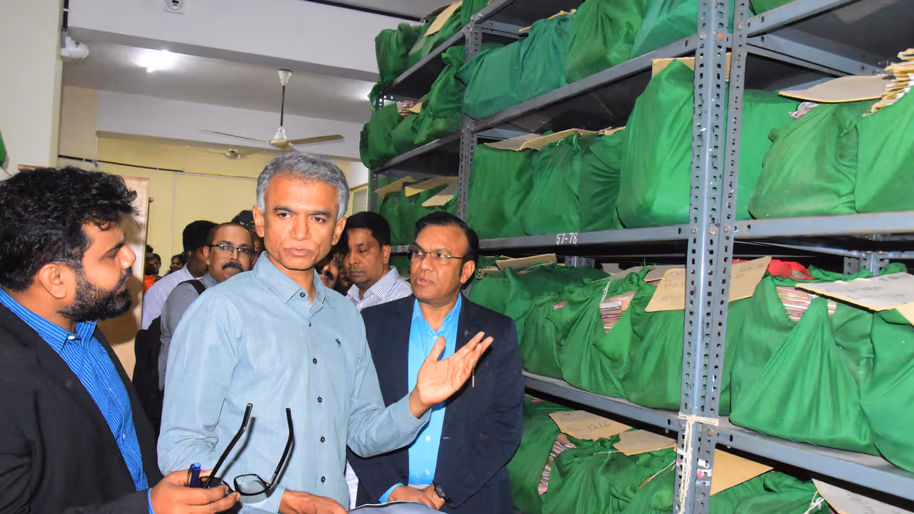 ಬೆಂಗಳೂರು ನಗರ ಜಿಲ್ಲೆಯ ಜಿಲ್ಲಾಡಳಿತ ಕಚೇರಿಯಲ್ಲಿರುವ ರೆಕಾರ್ಡ್ ರೂಮ್ ದಾಖಲೆಗಳನ್ನು ‘ಭೂ ಸುರಕ್ಷಾ’ ಯೋಜನೆ ಅಡಿಯಲ್ಲಿ ಸ್ಕ್ಯಾನಿಂಗ್ ಮಾಡಿ ಡಿಜಿಟಲೀಕರಿಸುವ ಅಭಿಯಾನಕ್ಕೆ ಕಂದಾಯ ಸಚಿವ ಕೃಷ್ಣ ಬೈರೇಗೌಡ ಚಾಲನೆ ನೀಡಿದರು.