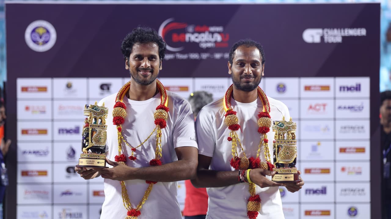 ಭಾರತದ ಅಗ್ರ ಪುರುಷರ ಸಿಂಗಲ್ಸ್ ಆಟಗಾರ ಸುಮಿತ್ ನಗಲ್ ಅಭಿಯಾನ ಅಂತ್ಯಗೊಂಡಿದೆ. ಇಲ್ಲಿನ ಕೆಎಸ್ಎಲ್ಟಿಎ ಟೆನಿಸ್ ಸ್ಟೇಡಿಯಂನಲ್ಲಿ ಶನಿವಾರ ನಡೆದ ಡಬಲ್ಸ್ ಫೈನಲ್ನಲ್ಲಿ ಫ್ರೆಂಚ್ನ ಕಾನ್ಸ್ಟಾಂಟಿನೊ ಕೌಜ್ಮಿನ್ ಮತ್ತು ಮ್ಯಾಕ್ಸಿಮ್ ಜಾನ್ವಿಯರ್ ಜೋಡಿಯನ್ನು 6-3, 6-4 ನೇರ ಸೆಟ್ಗಳಲ್ಲಿ ಸೋಲಿಸಿದ ಭಾರತೀಯ ಜೋಡಿ ಡಬಲ್ಸ್ ಕಿರೀಟವನ್ನು ತಮ್ಮ ಮಡಿಲಿಗೆ ಹಾಕಿಕೊಂಡಿತು.