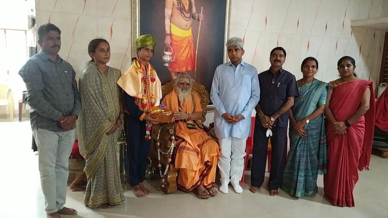 ೧೦ ಟಿವಿಕೆ ೨ - ಅಂತರಾಷ್ಟ್ರೀಯ ಕ್ರೀಡಾಕೂಟಕ್ಕೆ ಆಯ್ಕೆಯಾದ ತುರುವೇಕೆರೆಯ ಐಪಿಎಸ್ ನ ವಿದ್ಯಾರ್ಥಿನಿ ಕೆ.ಎಂ.ಚಿನ್ಮಯಿಯನ್ನು ವಿರಕ್ತ ಮಠದ ಶ್ರೀಗಳು ಗೌರವಿಸಿದರು. | Kannada Prabha