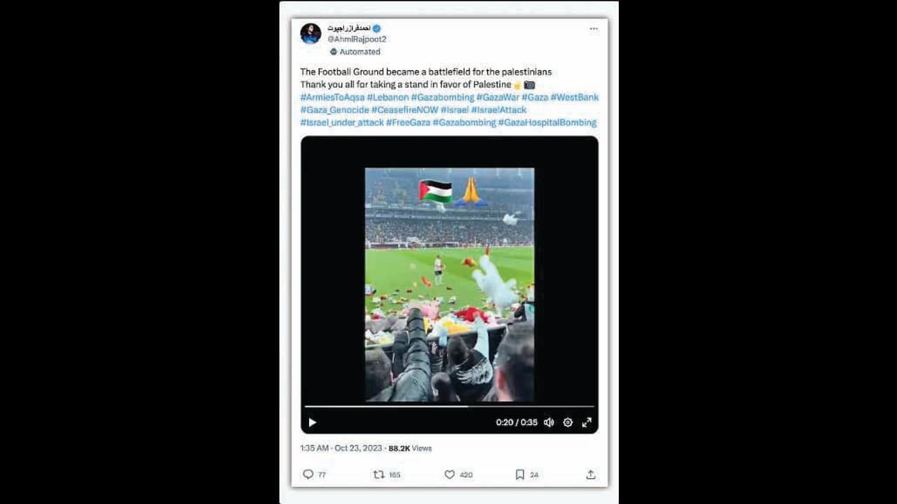 ಇಸ್ರೇಲ್ ಹಮಾಸ್ ನಡುವೆ ಯುದ್ಧ ಆರಂಭವಾದ ಮೇಲೆ ಫುಟ್ಬಾಲ್ ಪಂದ್ಯದಲ್ಲಿ ಬೊಂಬೆಗಳನ್ನು ಎಸೆದು ಅಭಿಮಾನಿಗಳು ಪ್ಯಾಲೆಸ್ತೀನ್ಗೆ ಬೆಂಬಲ ನೀಡಿದ್ದಾರೆ ಎಂಬ ವಿಡಿಯೋವೊಂದು ಸಾಮಾಜಿಕ ಜಾಲತಾಣದಲ್ಲಿ ಹರಿದಾಡುತ್ತಿದೆ.